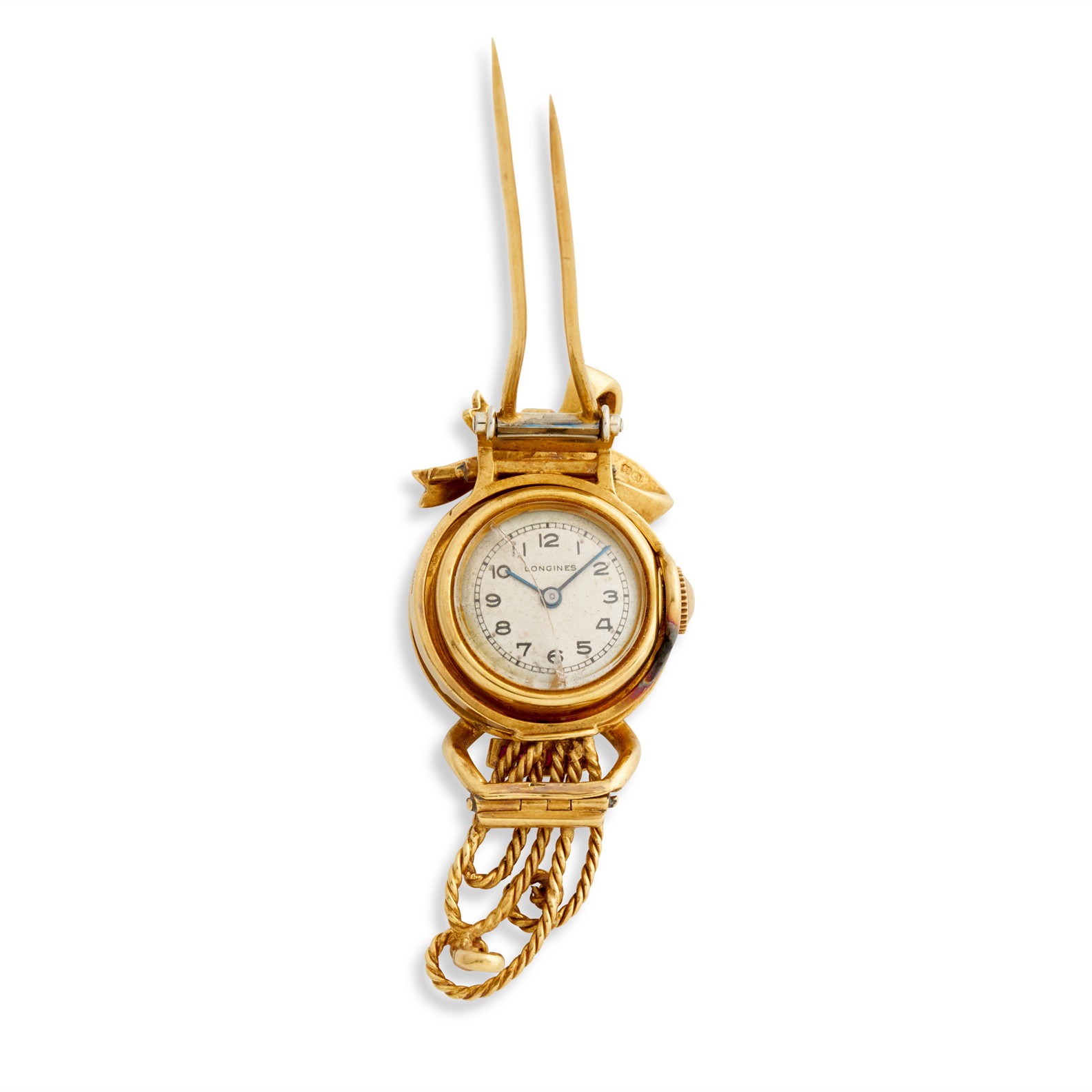 Of retro ribbon and rope design, embellished by square-cut rubies the domed cover opening to reveal a watch face with silvered dial, blue steeled hands and Arabic numerals, manual wind, length 50mm, gross weight approximately 23.5 grams, dial signed Longines.