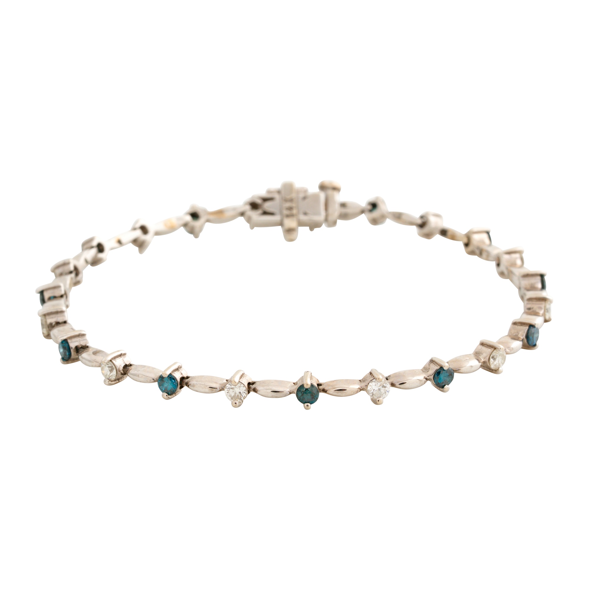Comprising twenty-three alternating white round brilliant-cut diamonds and treated blue round brilliant-cut diamonds, separated by domed oval bars, the diamonds together weighing approximately 0.25 carats, completed by a snap lock clasp,