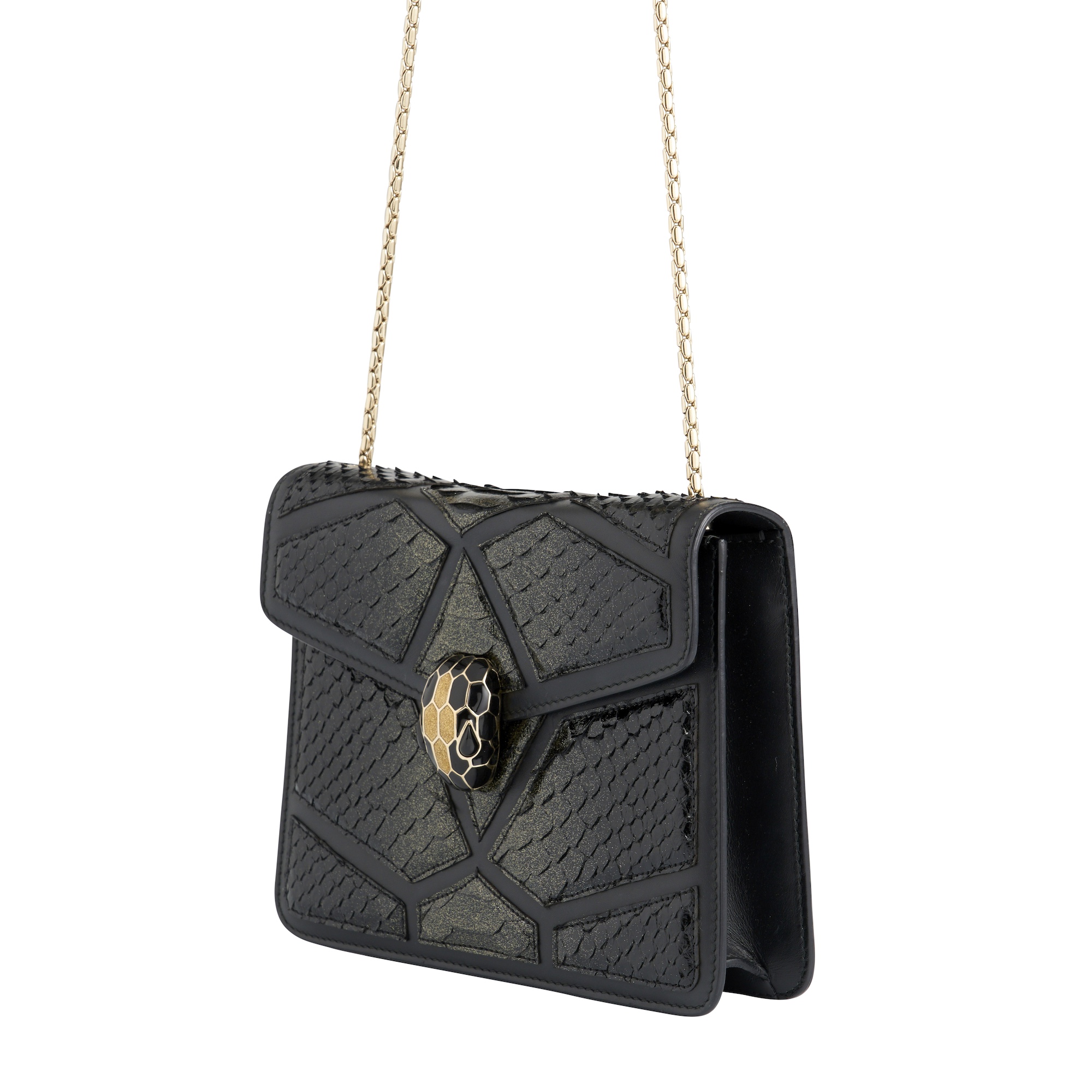 Styled in black leather with sparkly snakeskin accents, featuring gold tone hardware, with chain strap and python head snap closure details, 20 x 15 x 4 cm.