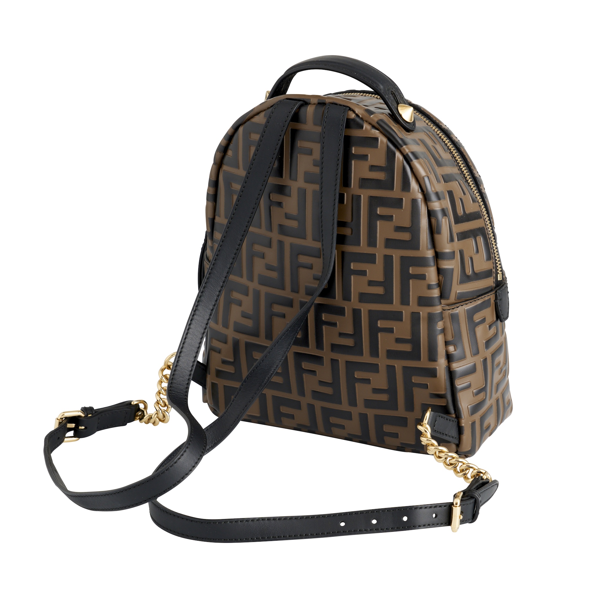 Styled in logo embossed chocolate leather with black leather trim and gold tone hardware, 22 x 23 x 11 cm.