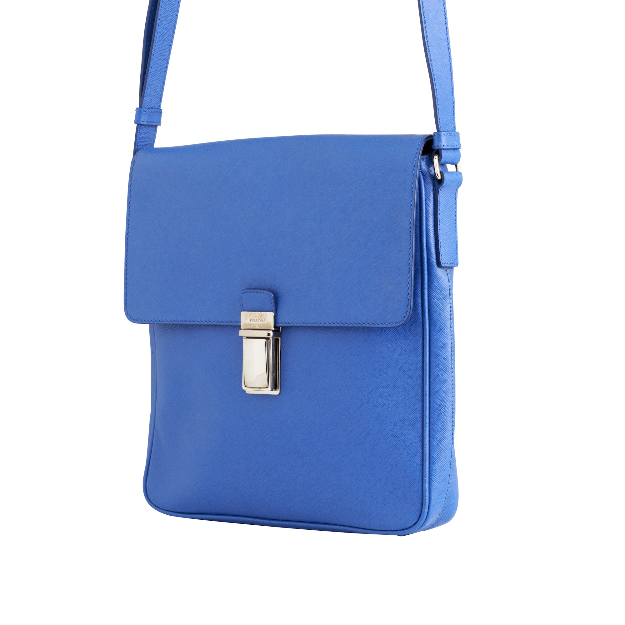 Styled in blue Saffiano leather with silver tone hardware, featuring adjustable crossbody strap, measures 26 x 26 x 4.5 cm.