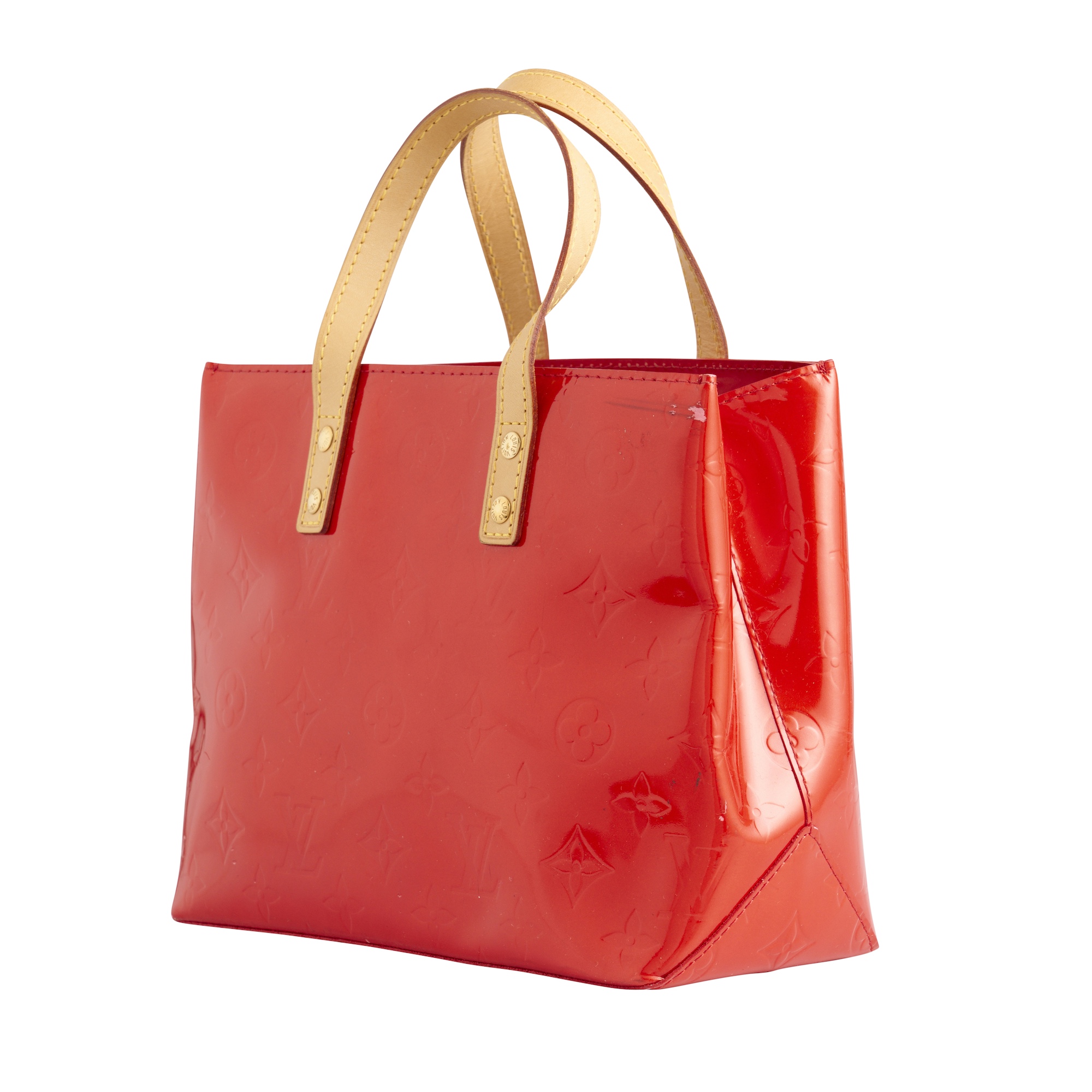 Styled in red monogram vernis patent leather, featuring gold tone hardware and vachetta leather handles, measures 25 x 18 x 10 cm.