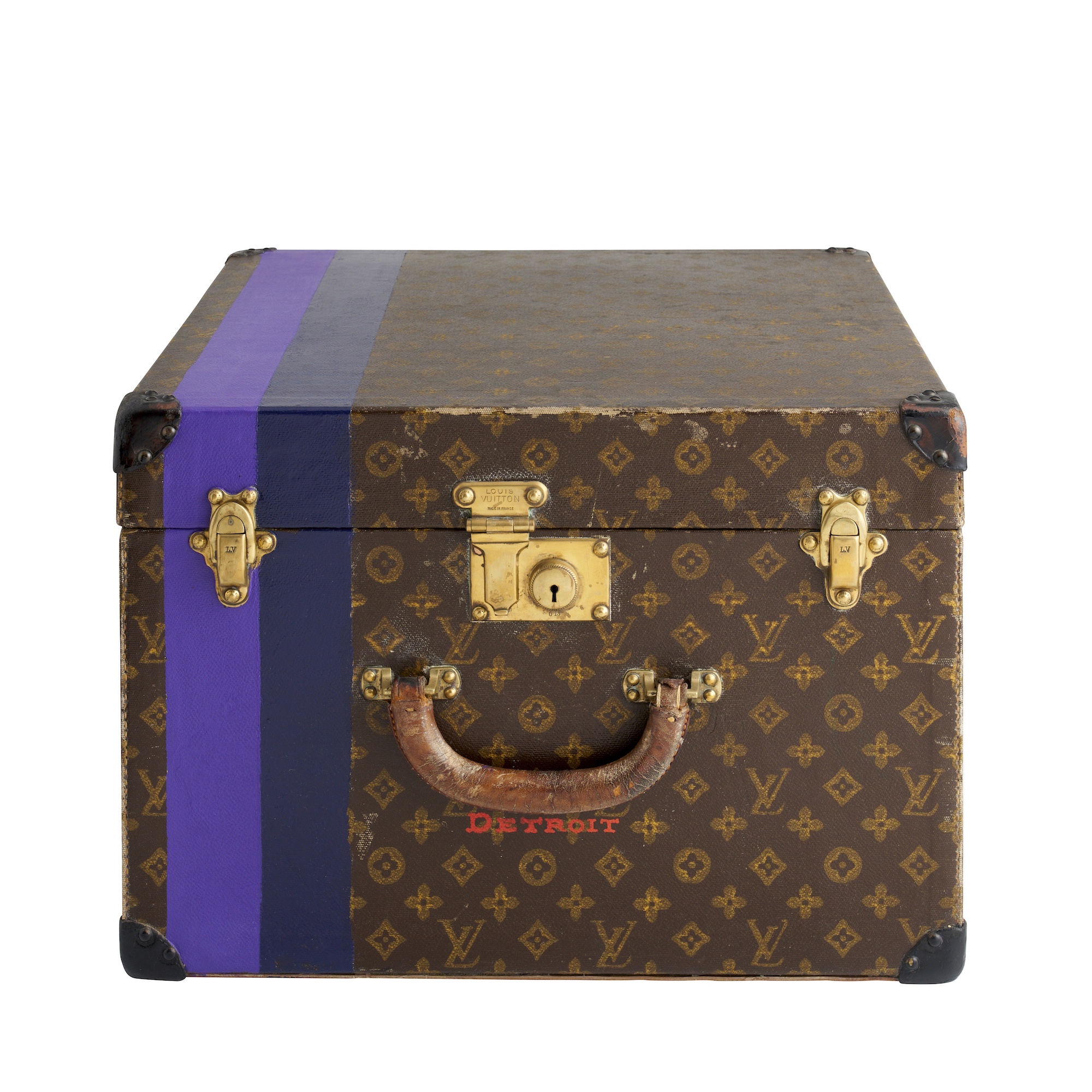 Styled in monogram canvas with reinforced brass corners and original brass hardware. The leather handle is stamped L.V., and the painted violet–cobalt stripe provides a distinctive customised accent. The interior includes removable trays and retains both the Louis Vuitton serial label and a retailer's label for B. Altman & Co., New York. Measures 45 x 31 x 45 cm.