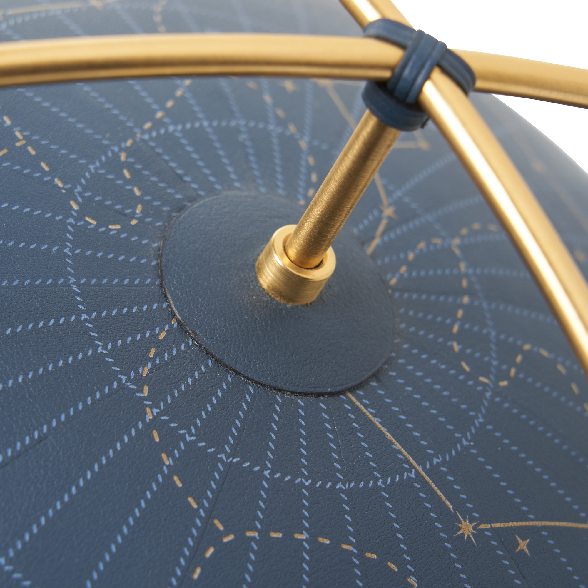 Swift calfskin and gold-plated stainless steel. Leather marquetry with detailed celestial mapping in gold on Prussian blue ground.