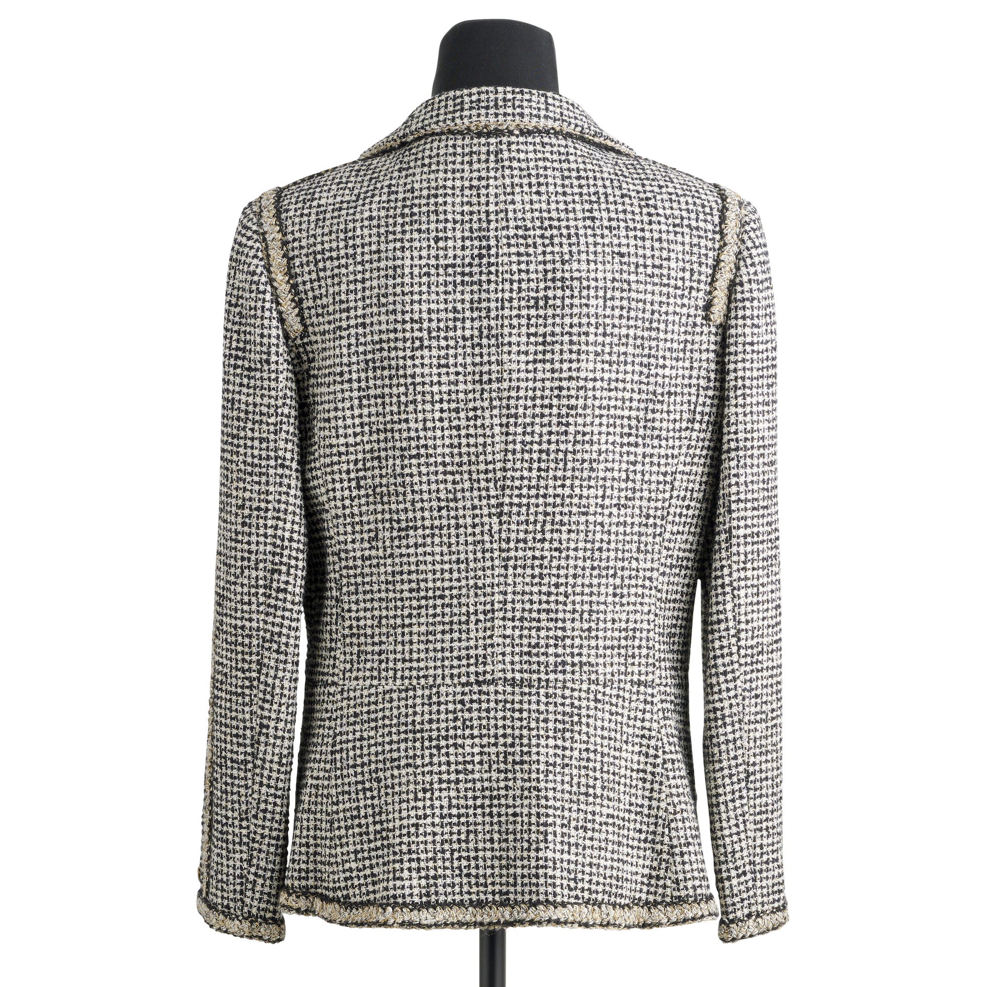 Styled in black, white and gold tweed with black silk lining, featuring braided trim across lapels, shoulders, edges, and faux pockets, marked size 40.