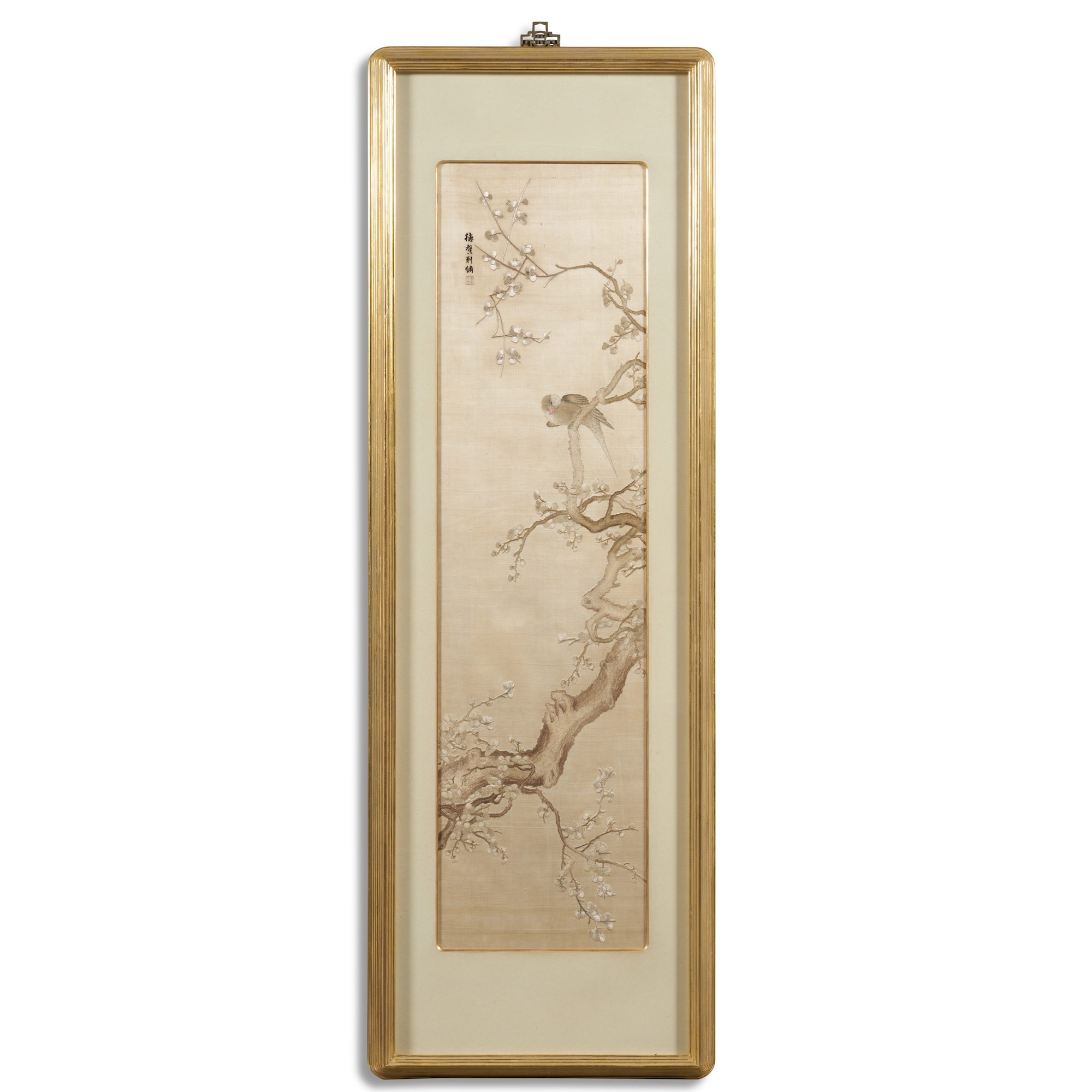 The silk panels in overall good condition, light spotting/ staining and minor loose threads in places