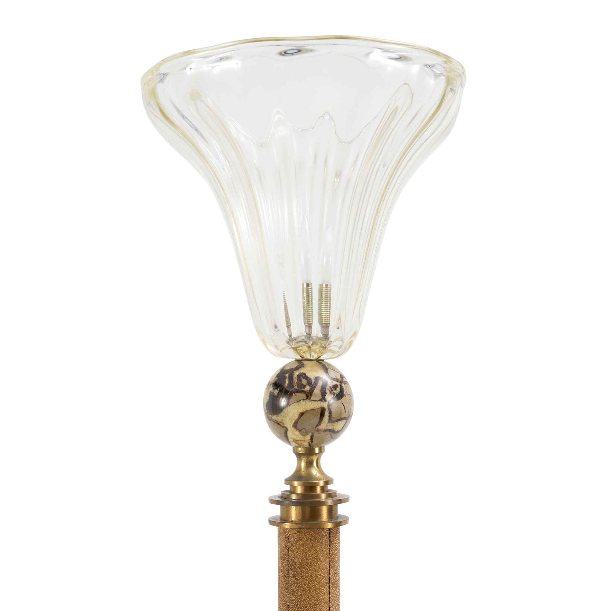 The light within an upward moulded glass shade mounted on a stone orb raised on the shagreen-covered standard with polished bronze bands, on a stepped circular black-japanned metal foot, Liblin's paper label underside