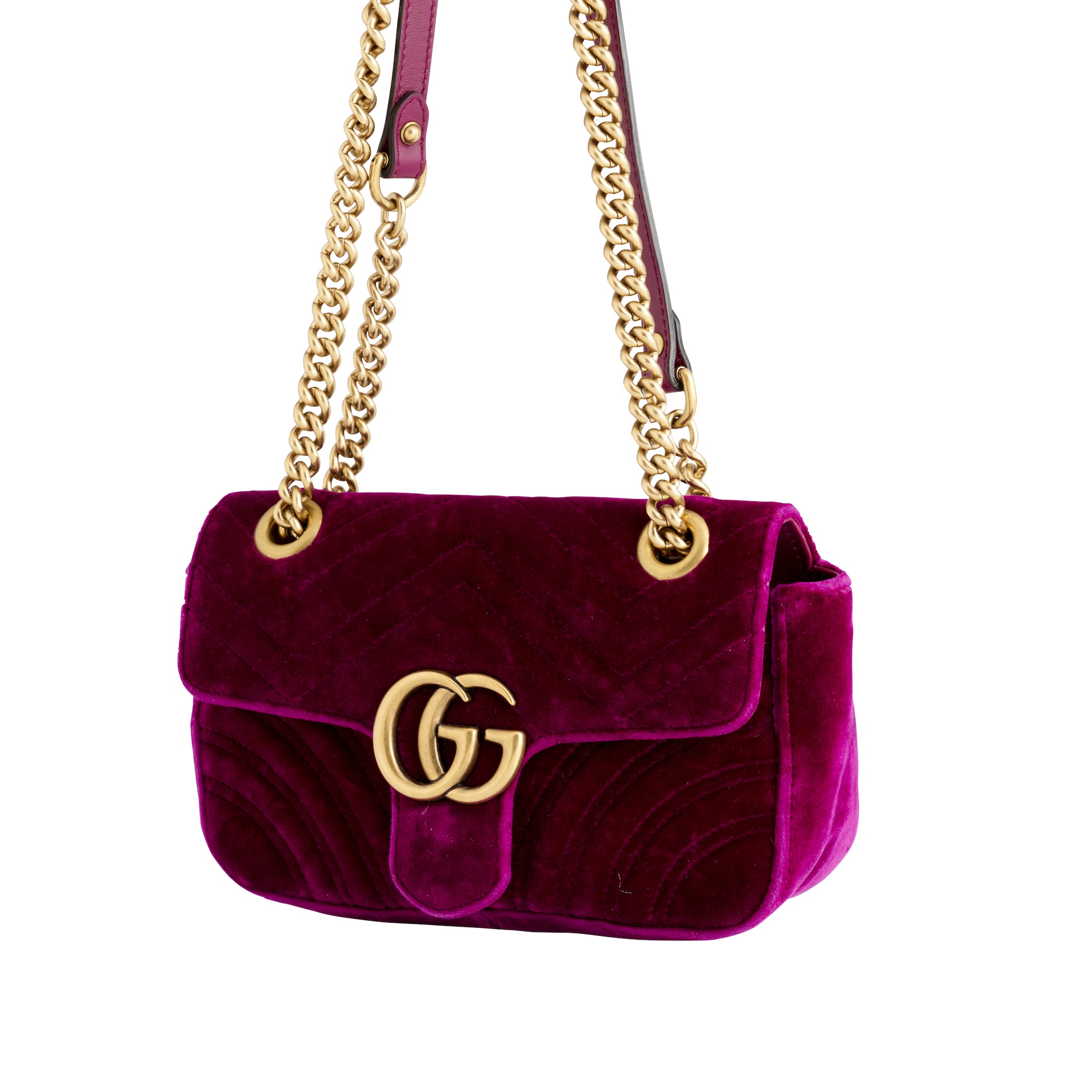 Styled in fuchsia chevron quilted velvet, featuring antique gold tone double 'G' logo to the front flap and sliding leather and chain strap, measures 21 x 14 x 6 cm.