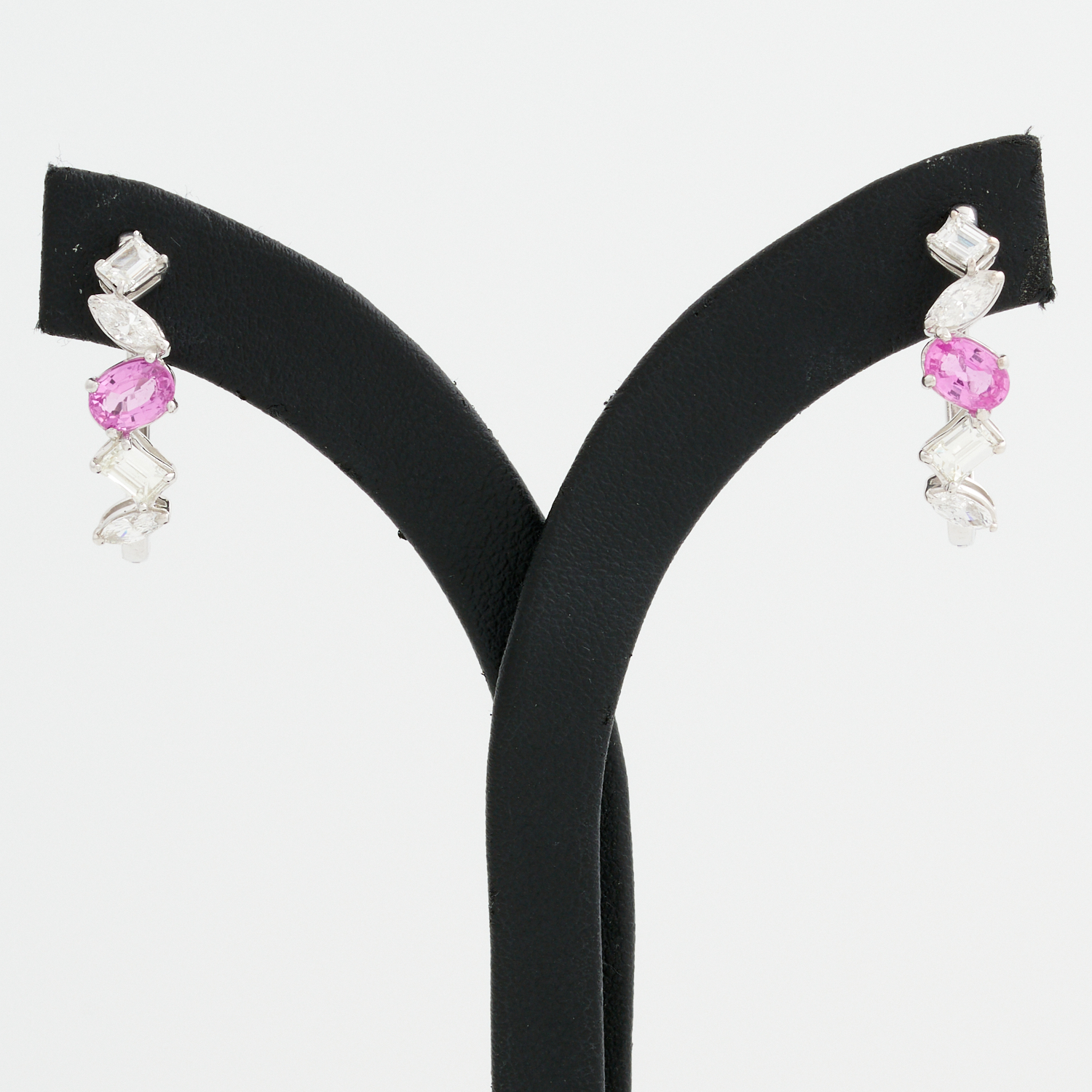 A PAIR OF PINK SAPPHIRE AND DIAMOND EARRINGS IN 14CT WHITE GOLD TO POST AND CLIP HOOP FITTINGS, THE SAPPHIRES TOTALLING APPROXIMATELY 1.32 CTS, THE DIAMONDS WEIGHING APPROXIMATELY 1.15 CTS, TOTAL WEIGHT 3.55 GMS