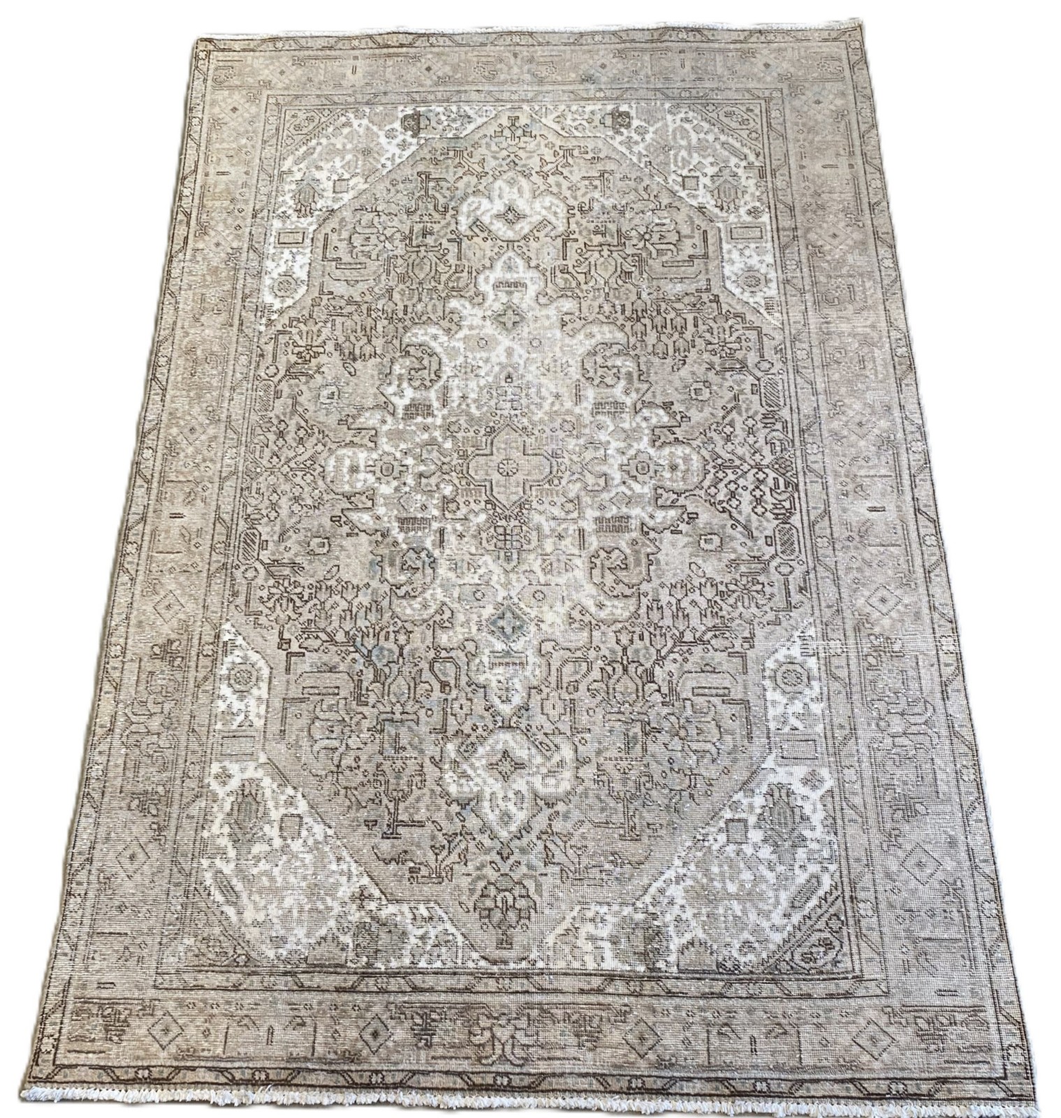 A DESIGNER RUG CREATED FROM A HAND-KNOTTED PERSIAN TABRIZ WITH A BOLD MEDALLION DESIGN. VINTAGE WOOLLEN PILE.