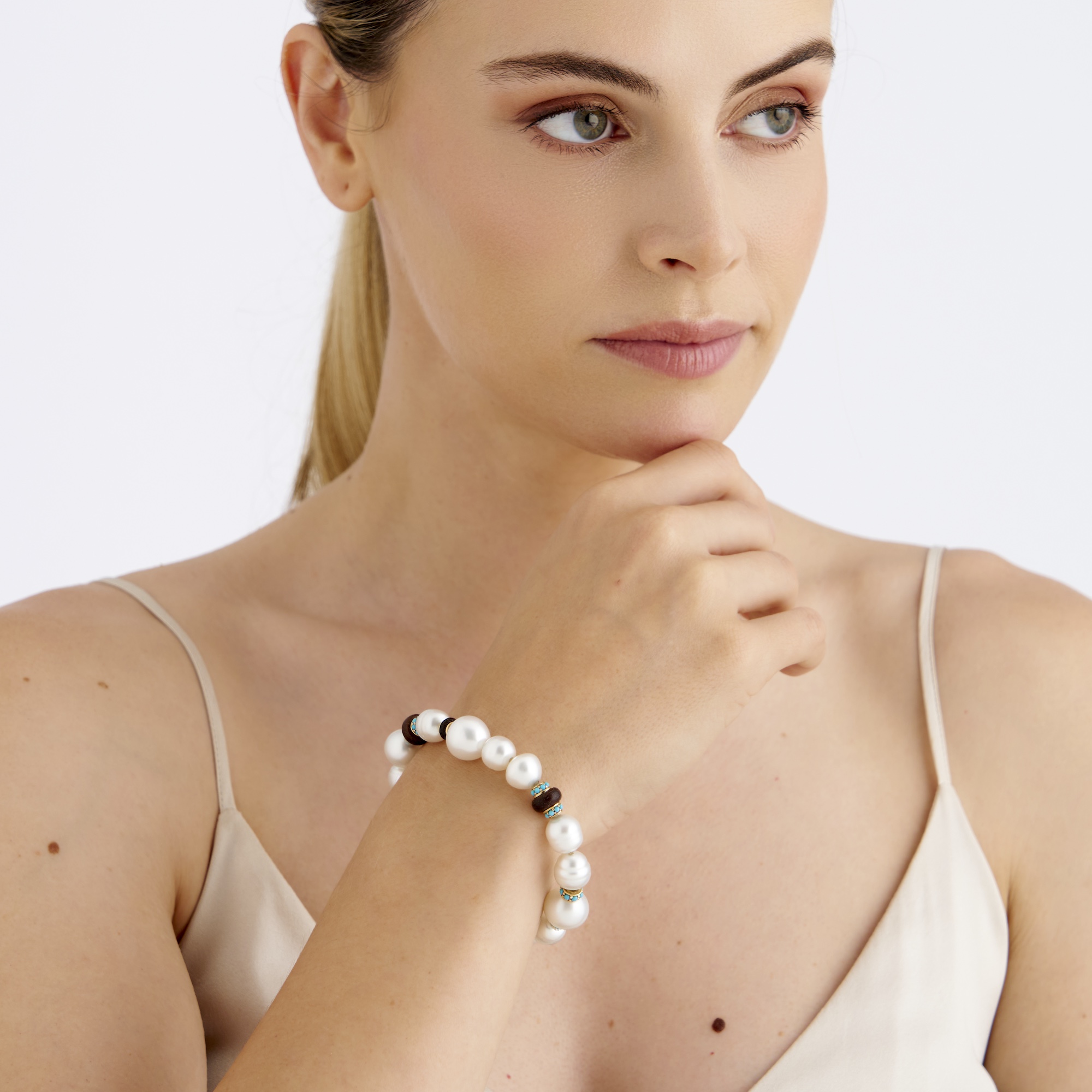 Modelled as a line of Australian South Sea circlé pearls measuring approximately 9.5mm to 12.7mm with spacers of wood and gem-set turquoise cut en-cabochon, inner circumference approximately 160mm (elasticated), gross weight approximately 42.0 grams.