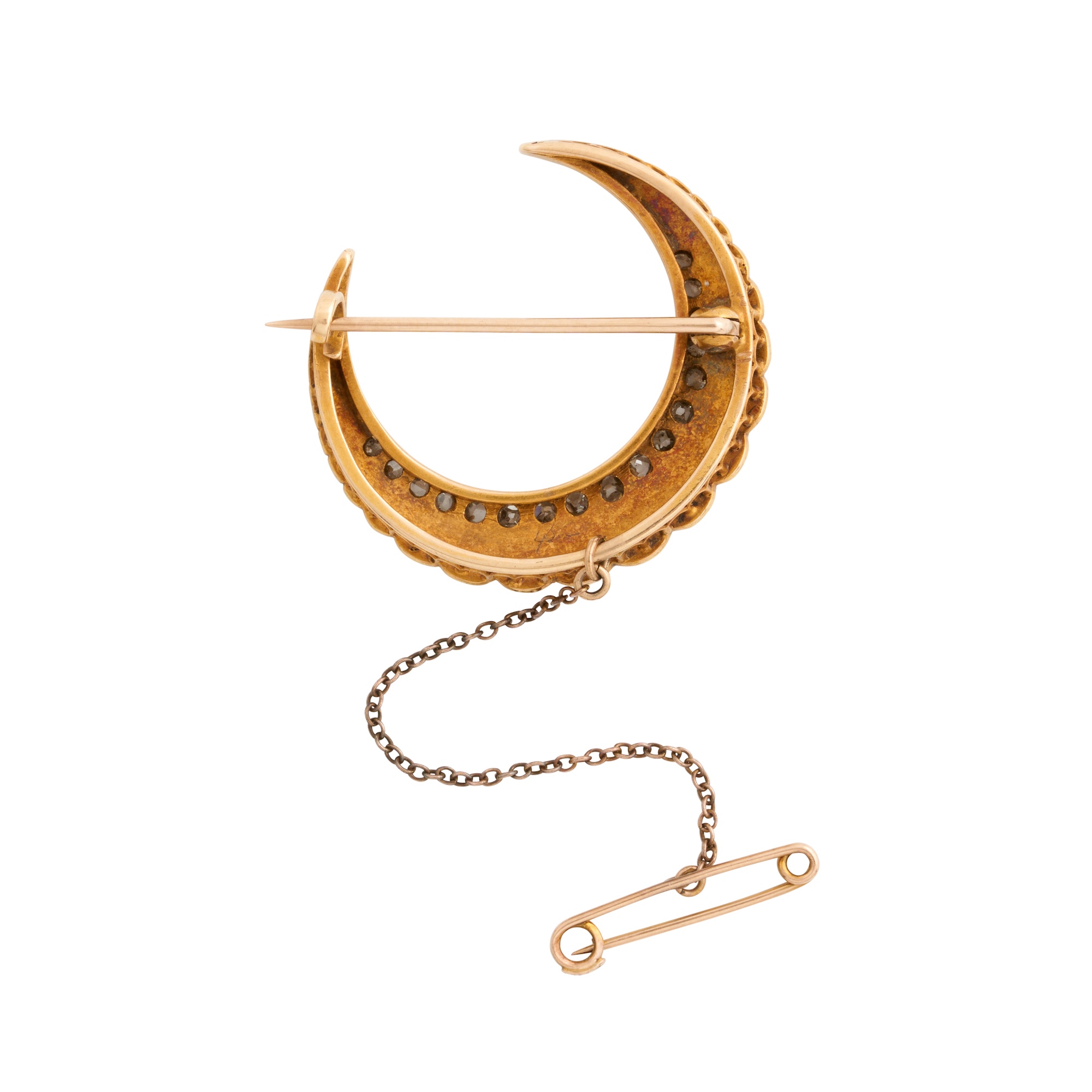 Modelled as a crescent, detailed with a row of graduating round pearls in cream hues and a row of graduating claw-set old European-cut diamonds, length 30mm, width 33mm, gross weight approximately 8.3 grams.