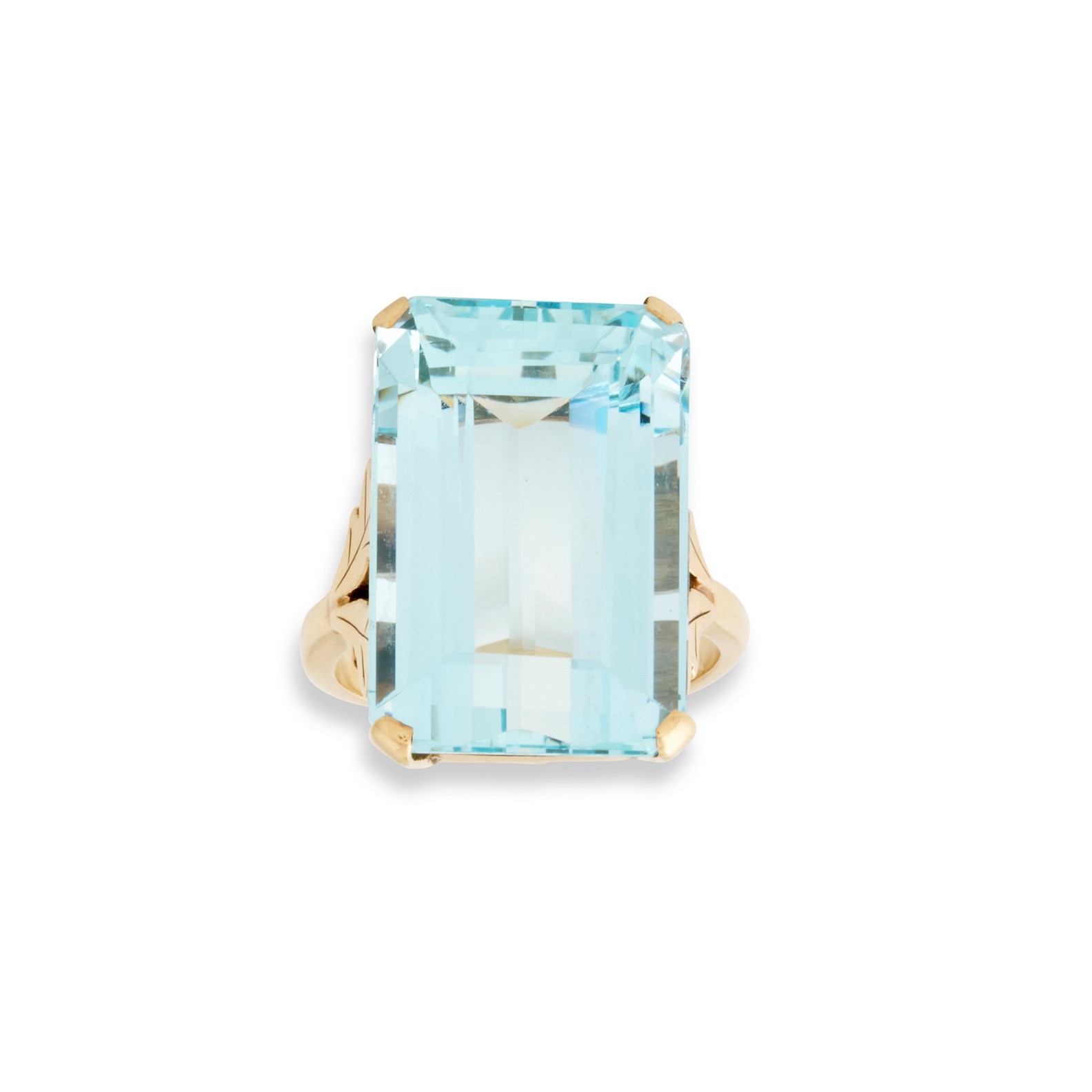 Centring a claw-set emerald-cut aquamarine weighing approximately 23.61 carats, to shoulders of foliate design, mounted in 9ct gold, ring size O1/2, gross weight approximately 9.7 grams.