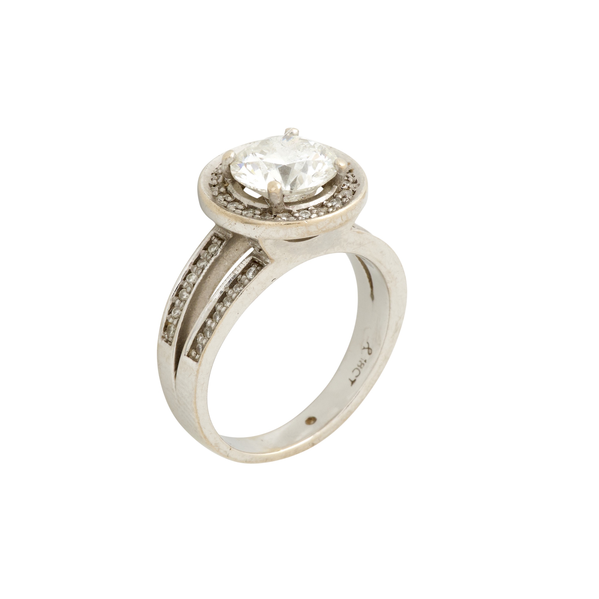 Of cluster design, centring a claw-set round brilliant-cut diamond weighing 1.60 carats, within a surround and to split band with claw-set with further round brilliant-cut diamonds, the diamonds together weighing approximately 0.10 carats, size J½, gross weight approximately 6.65 grams.