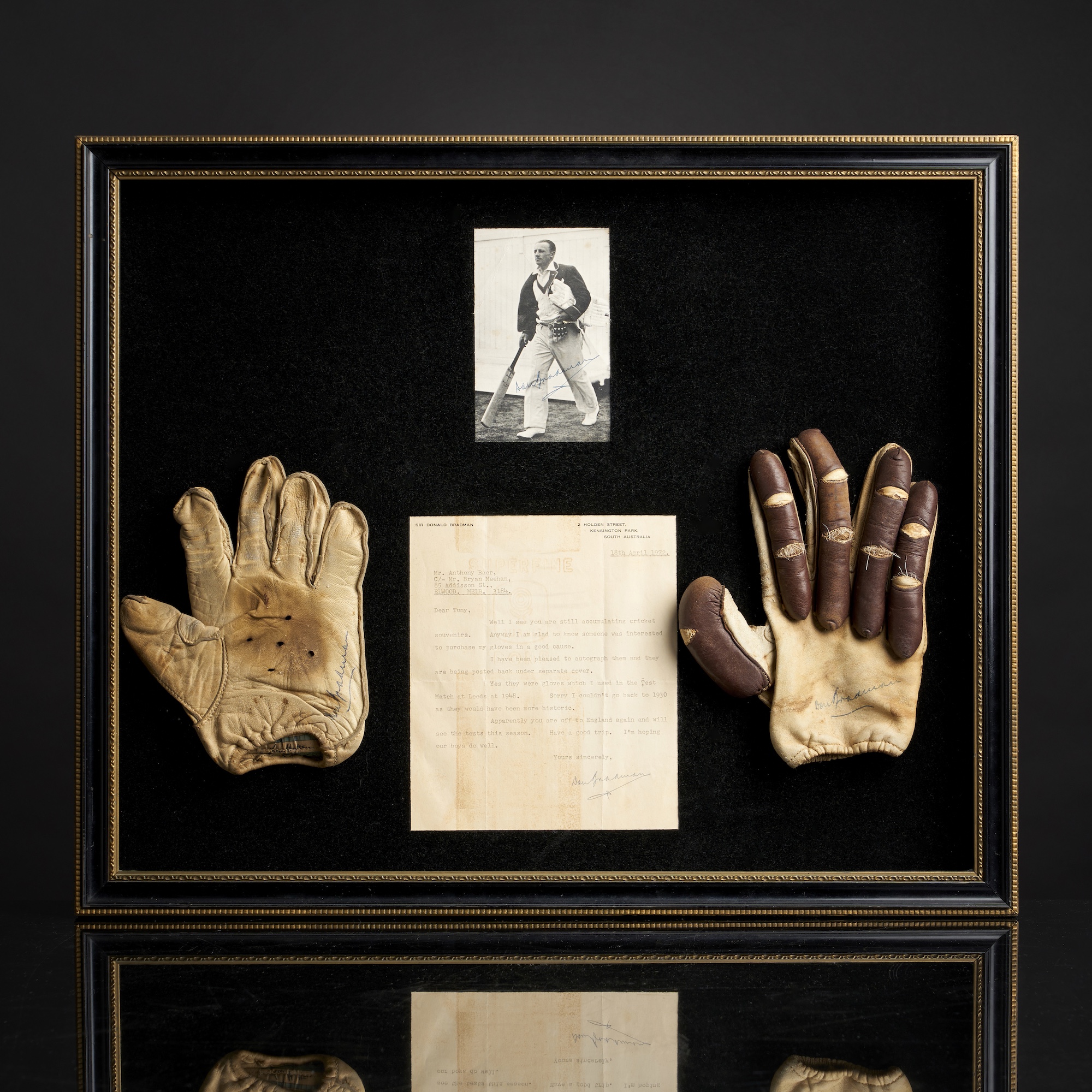 A pair of Surridge 'Len Hutton' leather batting gloves with 'sausage' padding, each glove signed by Bradman in blue ball-point pen, mounted and framed behind glass together with a typed and signed letter from Bradman to Anthony (Tony) Baer dated 18 April 1972 presenting the gloves and confirming their use in the 1948 Leeds test and an autographed original print of a 1934 photograph of Bradman at practice at Lord's