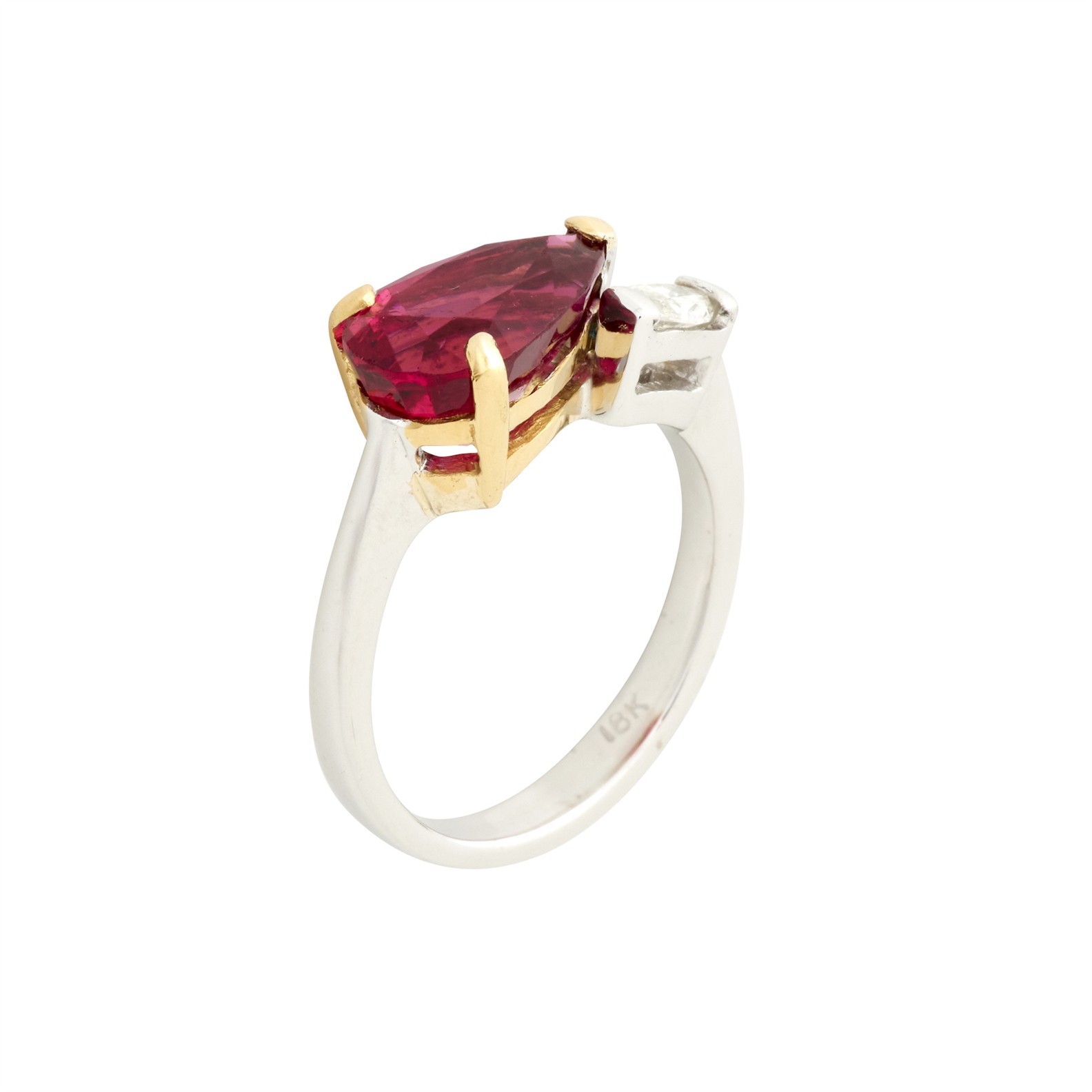 Of toi et moi design, comprising a claw-set pear-cut tourmaline weighing approximately 3.75 carats and a tension-set oval-cut diamond weighing approximately 0.24 carats, size P, gross weight approximately 5.80 grams.