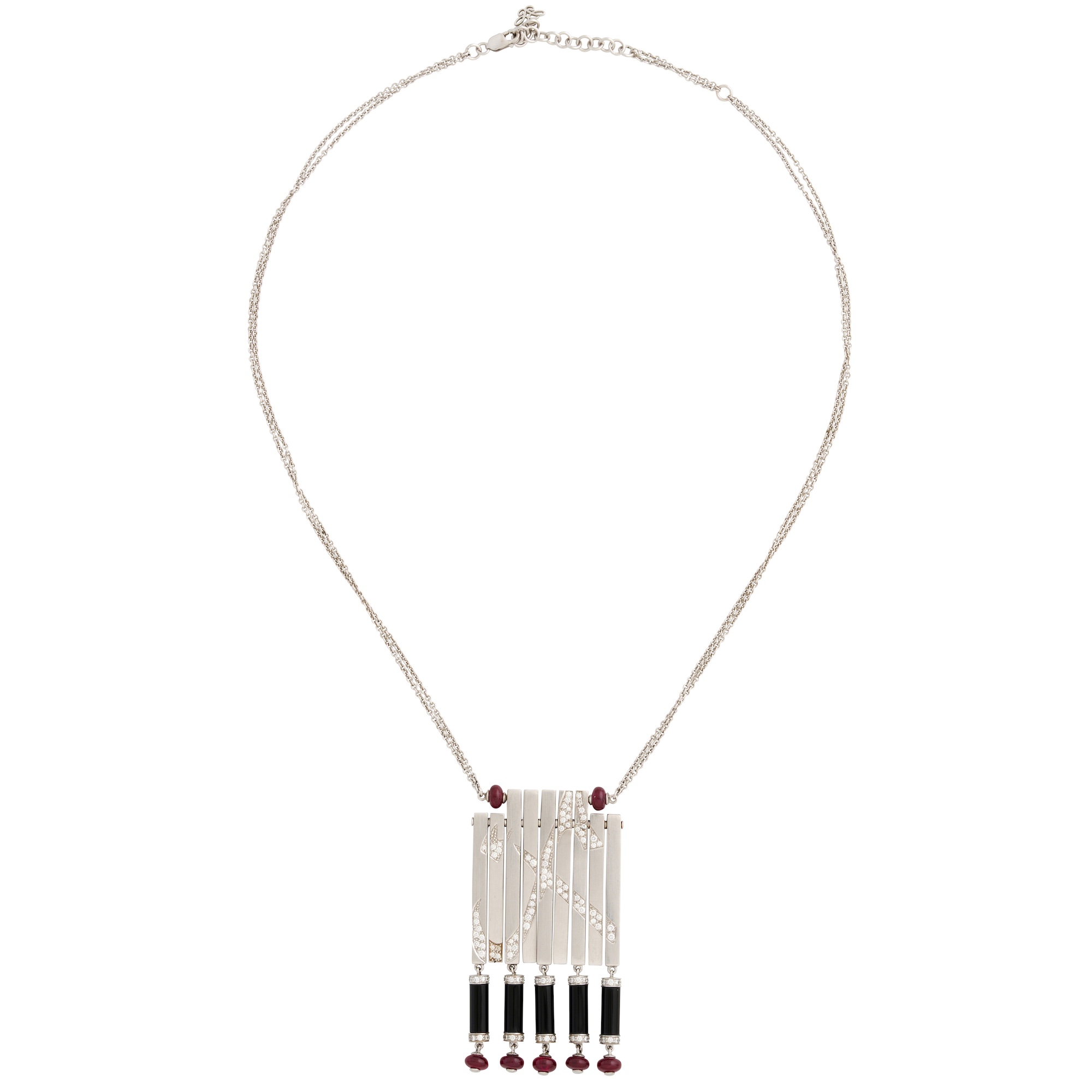 Of contemporary design, comprising articulated matt satin bars inset with a diamond motif, suspending onyx, diamond and ruby drops, to an integral double fine trace chain completed by a parrot clasp, length 450mm, gross weight approximately 32.3 grams.