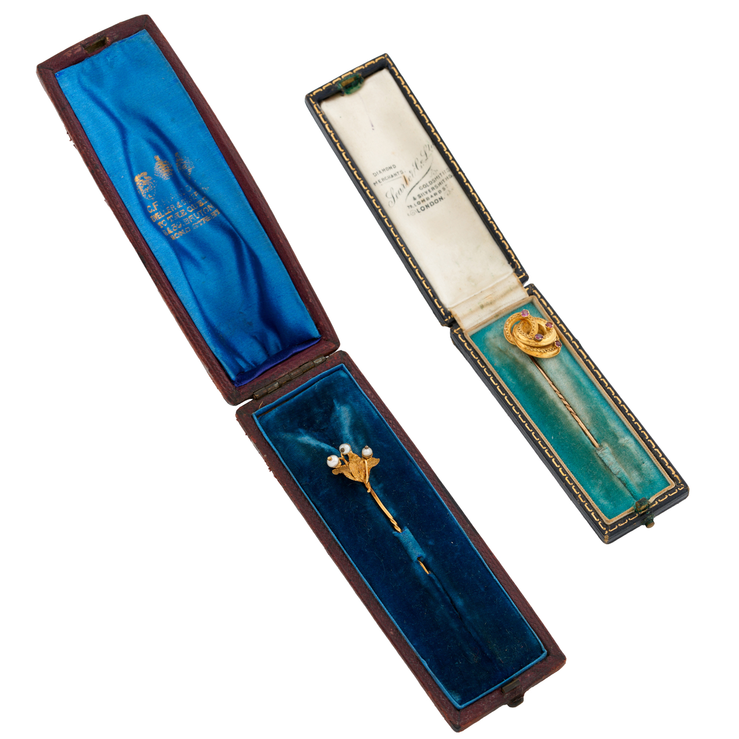 Lapel pin with seed pearls tests 18 carat, lapel pin with pink gemstones tests18 carat decoration, 9 carat pin