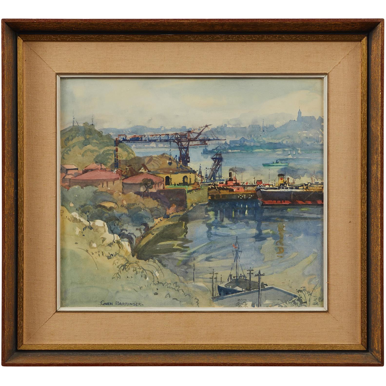 GWEN BARRINGER (1882-1960) Construction of a Bridge, Sydney - View Towards Balmain watercolour on paper 34.5 x 45cm (54 x 64cm framed)
