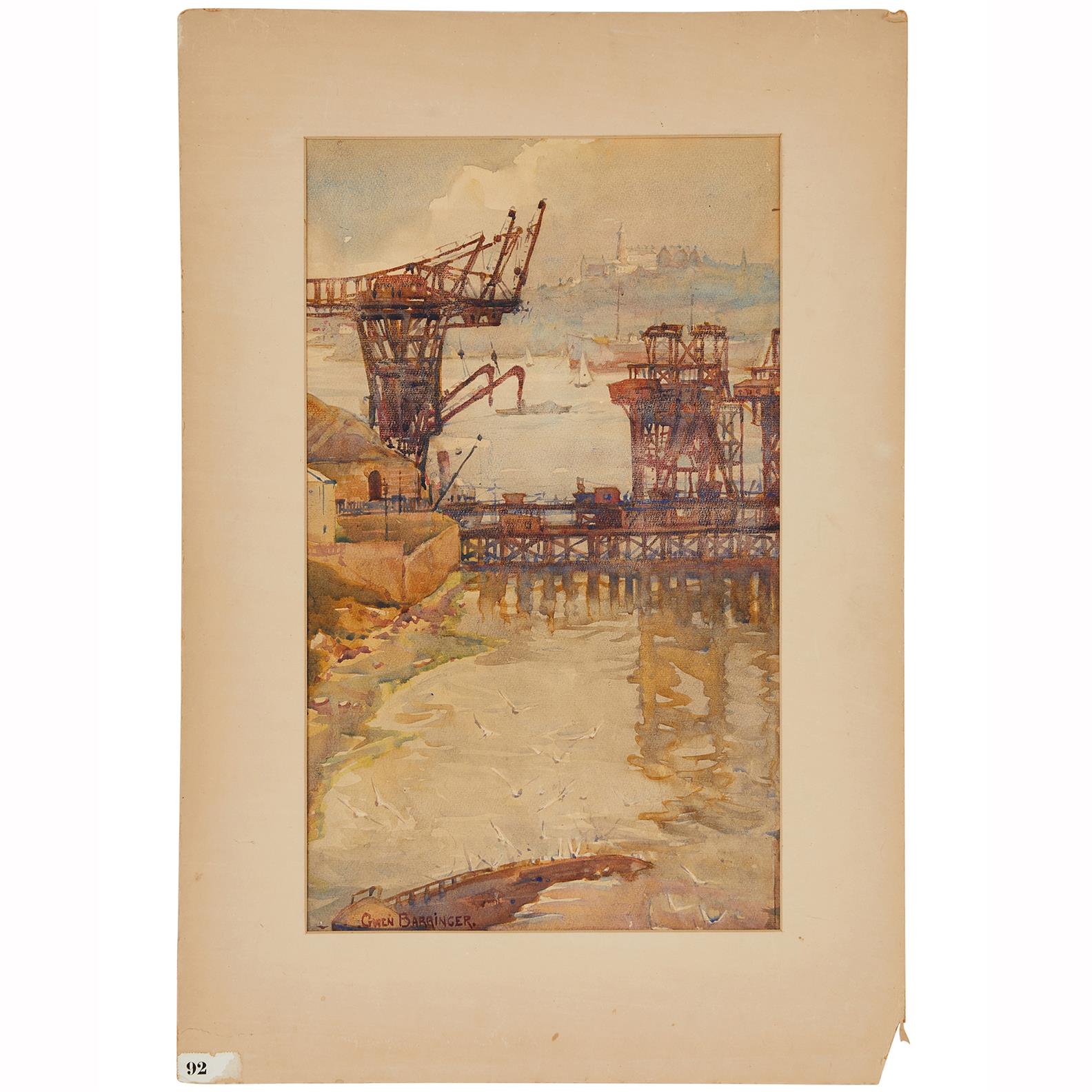 GWEN BARRINGER (1882-1960) Construction of a Bridge, Sydney - Cranes at Milsons Point watercolour on paper 39 x 44.5cm (58 x 64cm f...