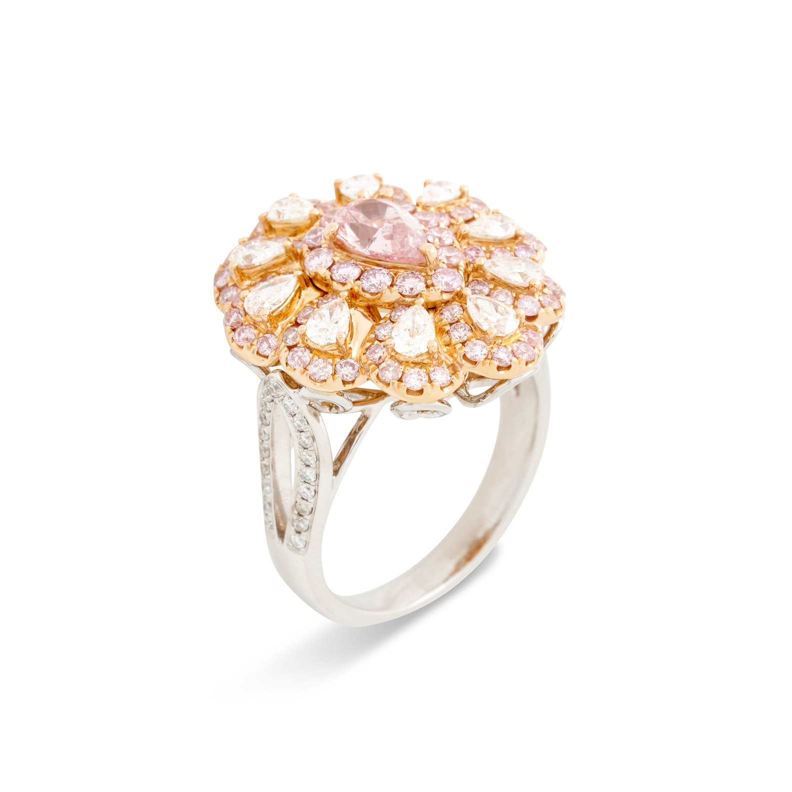 Of cluster design, centring a claw-set pear modified brilliant-cut fancy intense pink diamond weighing 0.53 carats, framed by a halo of fancy light pink brilliant-cut diamonds further bordered by a line of near colourless pear-shaped diamonds framed by pink diamonds, between openwork shoulders pavé-set with near colourless brilliant-cut diamonds, the near colourless and fancy light pink diamonds together weighing 0.88 carats and 0.84 carats respectively, mounted in platinum and 18ct gold, ring size L, gross weight approximately 10.0 grams.