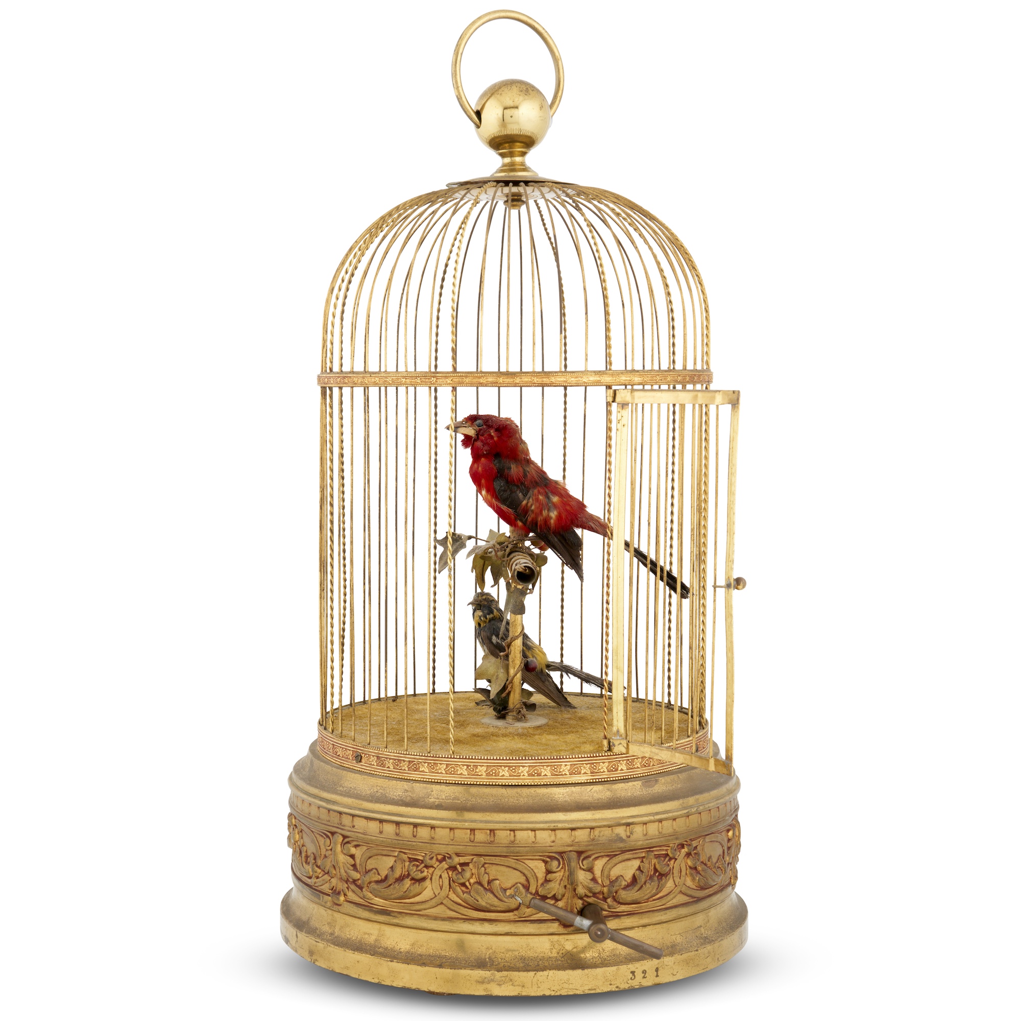 The key-operated mechanism with lever control with two speeds, modelled as two birds within a gilt metal hanging cage, both with automated tail, head and beak, one bird standing on the velvet lined cage, the other perched on a metal rod entwined with faux vines of leaves, the domed cage with a velvet lined interior above a circular base with a border of scrolling foliate motifs, all surmounted by a suspension ring