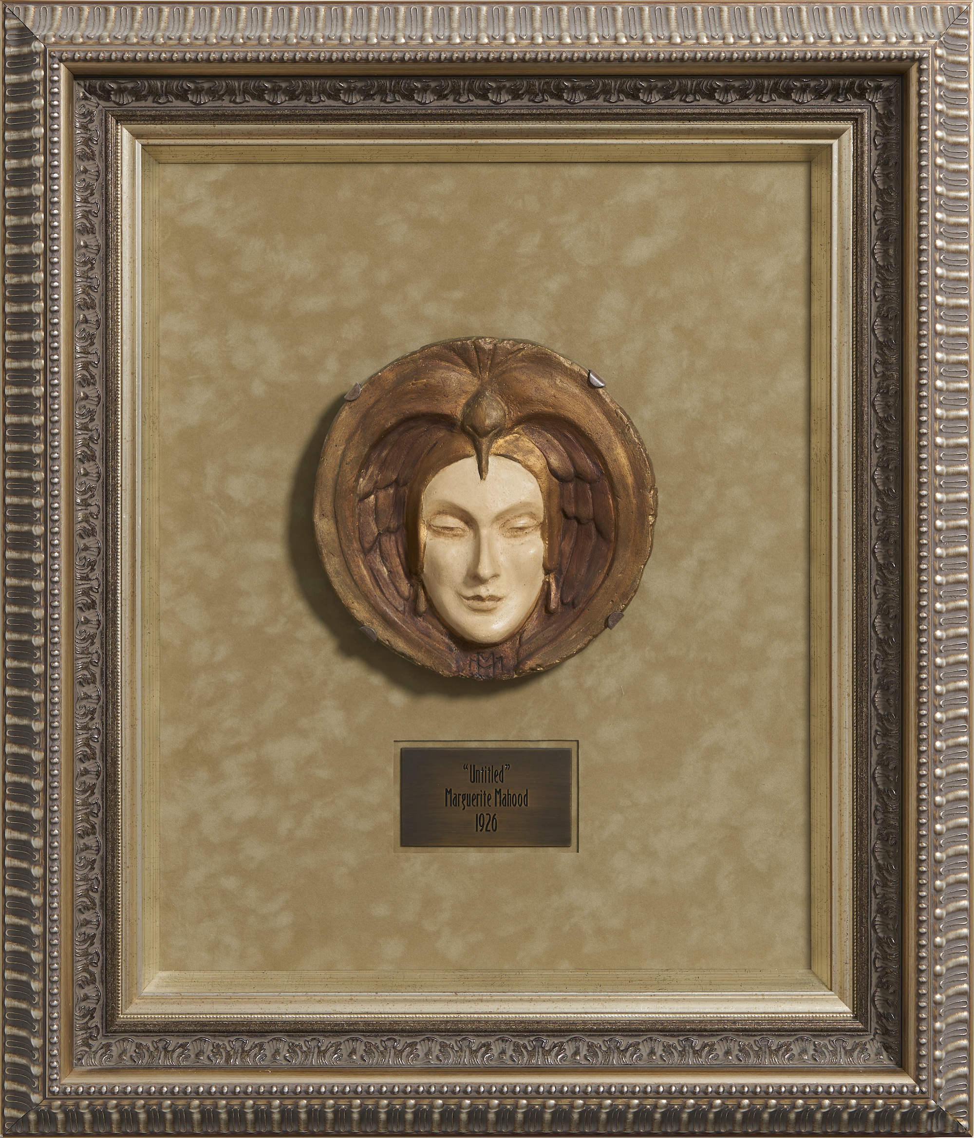 The female head with part-closed eyes and pursed lips, wearing a headdress in the form of a bird with its wing descending to frame the face, incised signature 'MM' in monogram lower centre, mounted and framed, inscribed as 'Untitled' and dated on an engraved plaque to the mount