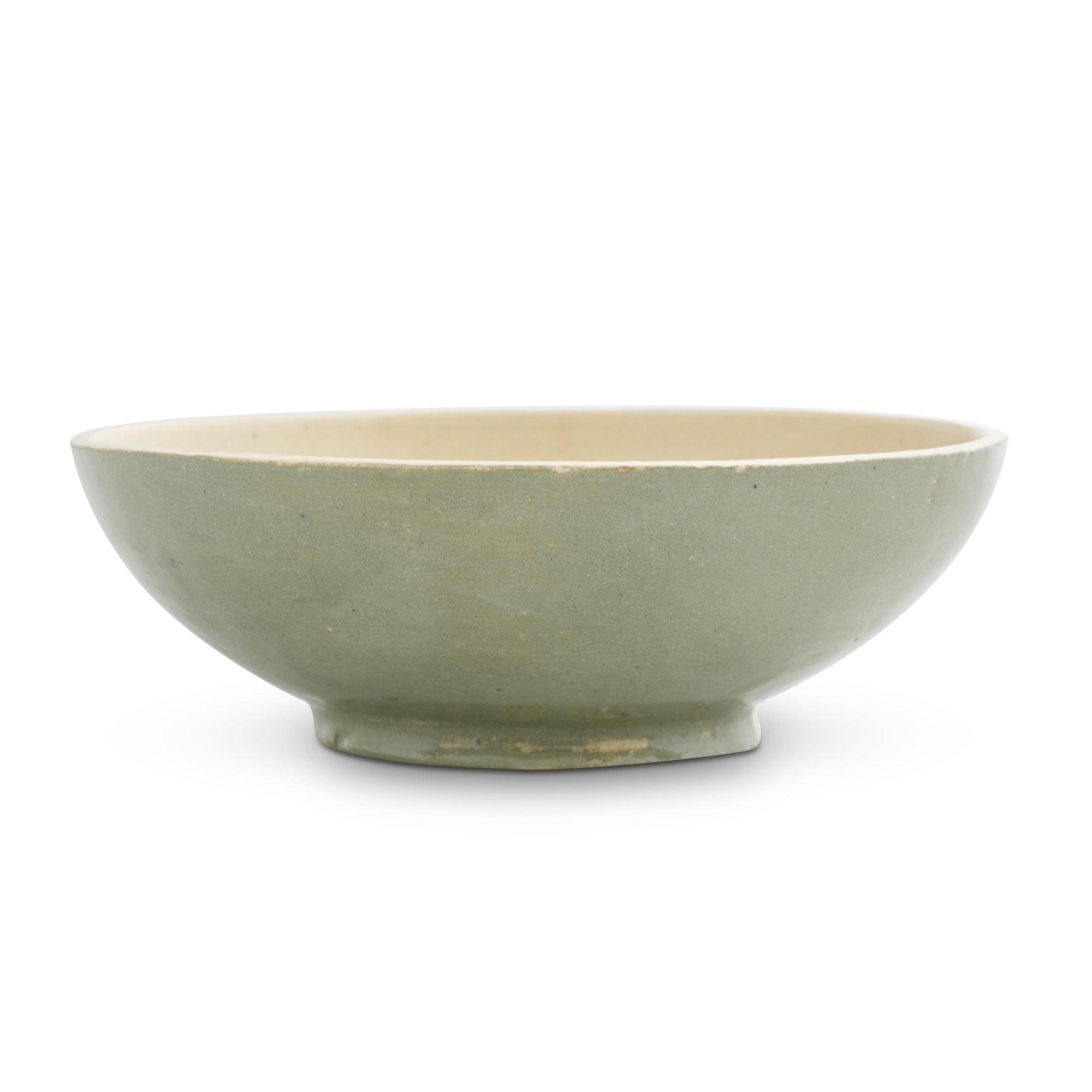 Circular with a shaped well, the interior decorated with a scrolling foliate design in black and brown against a cream ground, the exterior of the bowl in sage green glaze, incised signature 'Marguerite Mahood' and numbered 'F1244' underside