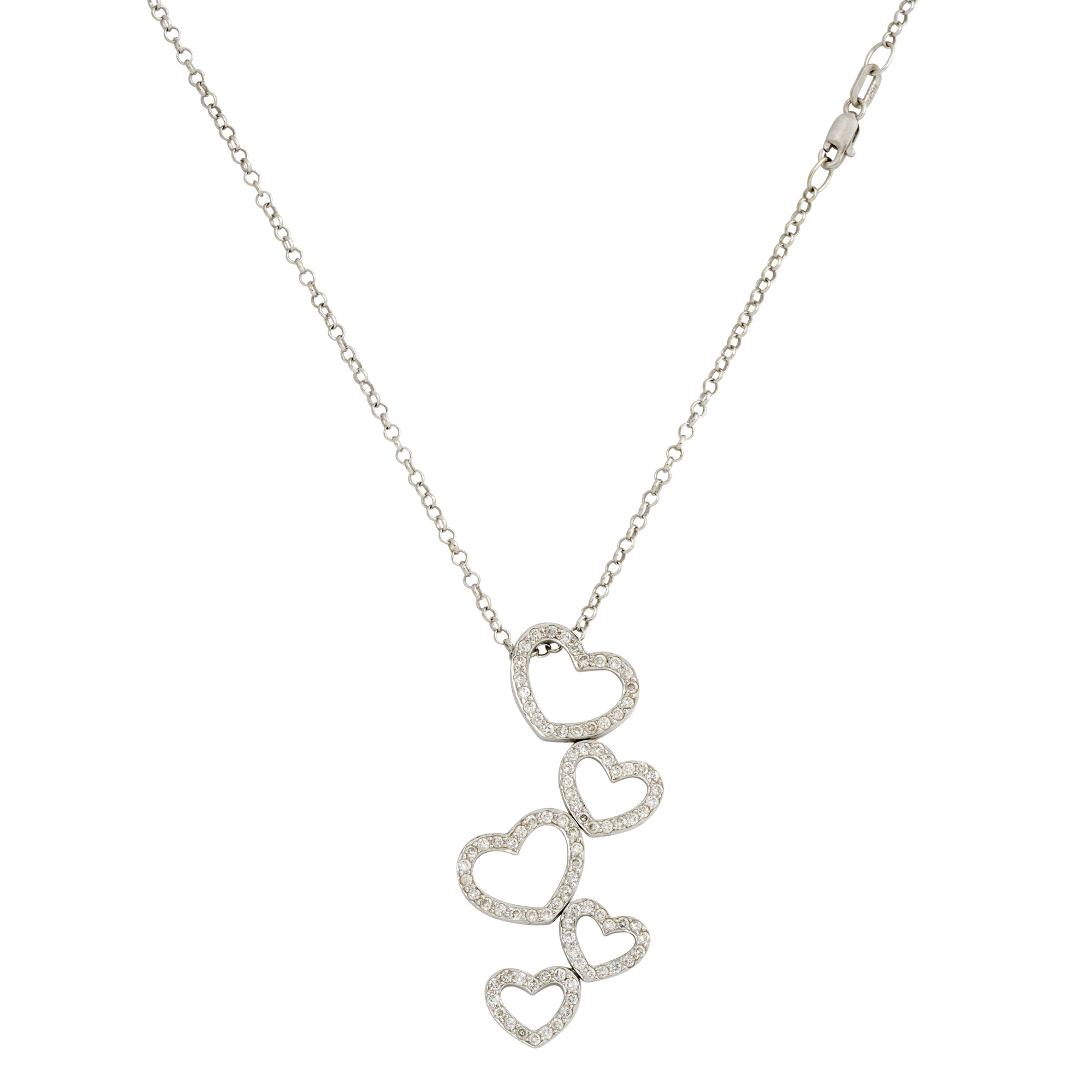 A drop pendant of five off-set, floating, claw-set diamond hearts to a hidden bale and trace chain, the diamonds together weighing approximately pendant length approximately 48mm, chain length approximately 500mm, gross weight approximately 8.6 grams.