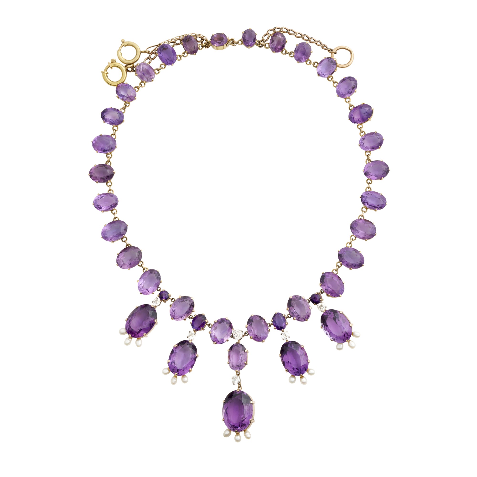 Victorian necklace featuring thirty-eight graduating oval amethysts in a claw-set gallery and five large drop amethysts articulating from claw-set old-cut diamonds with seed pearl detail, each amethyst weighing between approximately 1.75 and 12.60 carats, to an original hidden tongue snap fastener with recently modified extender chain and bolt ring, the diamonds together weigh approximately 1.71 carats, length approximately 450mm, gross weight approximately 76.0 grams.