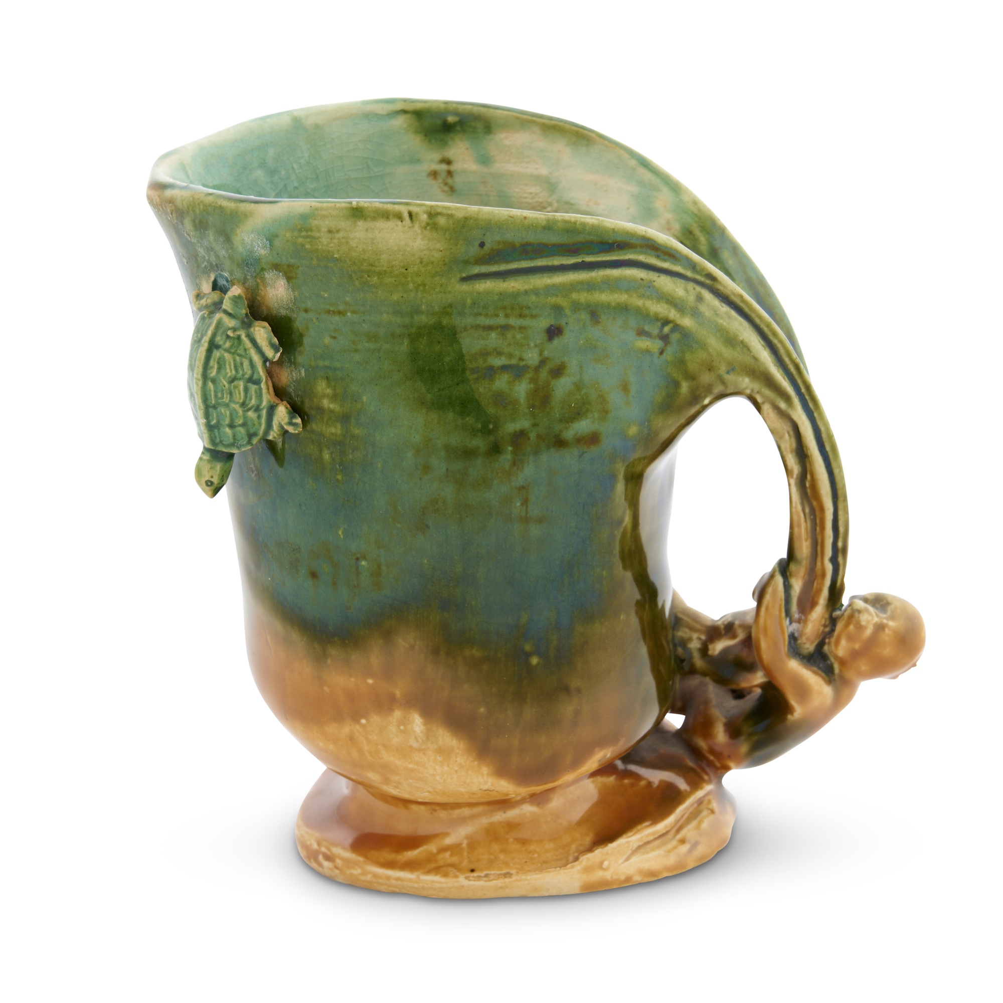 Of u-form with a rounded handle on a spreading circular foot, modelled with a goblin applied to the base of the handle and a turtle to the body, in green and tan glaze, incised signature 'MMahood' and numbered 'F 1328' underside