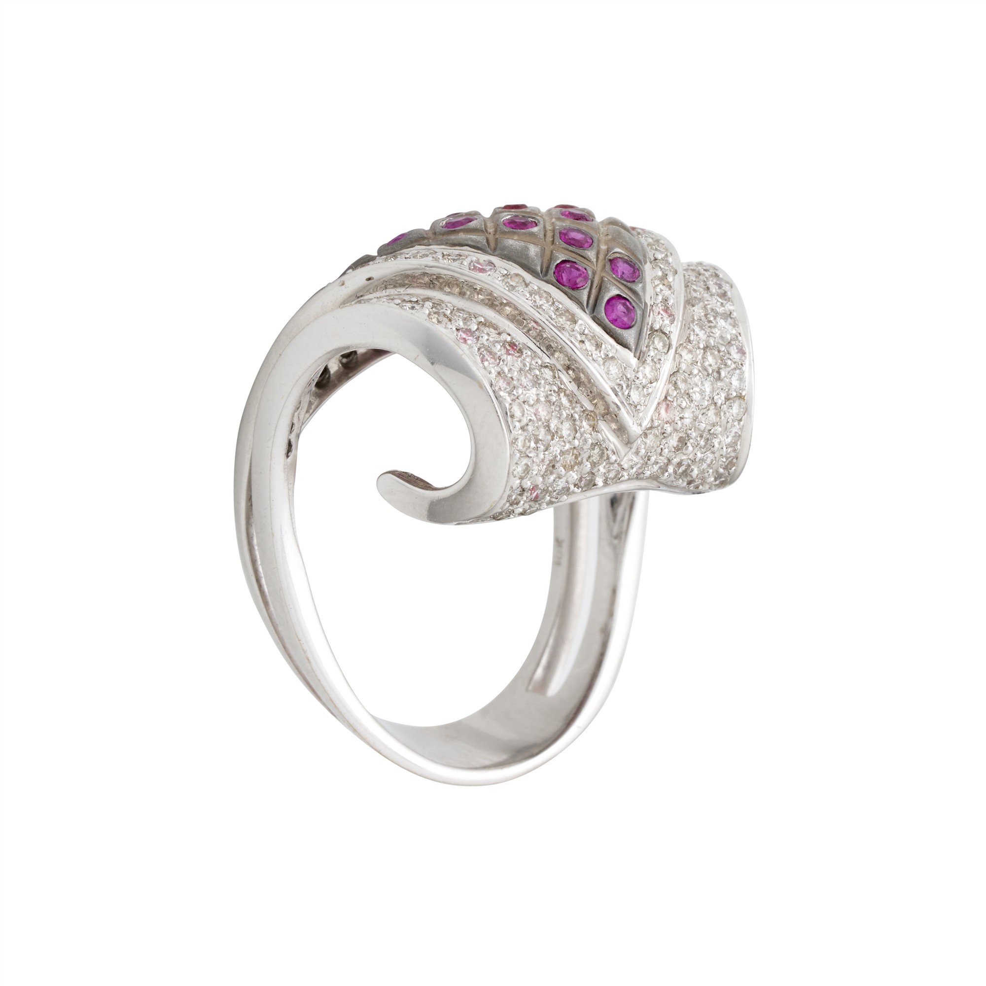 Of scrolled design of twenty-two claw-set rubies centrally set in a dark satin grid formation, raised above two tiers of pavé-set round brilliant-cut diamonds, the rubies together weighing approximately .60 carats, size P, gross weight approximately 12.0 grams.