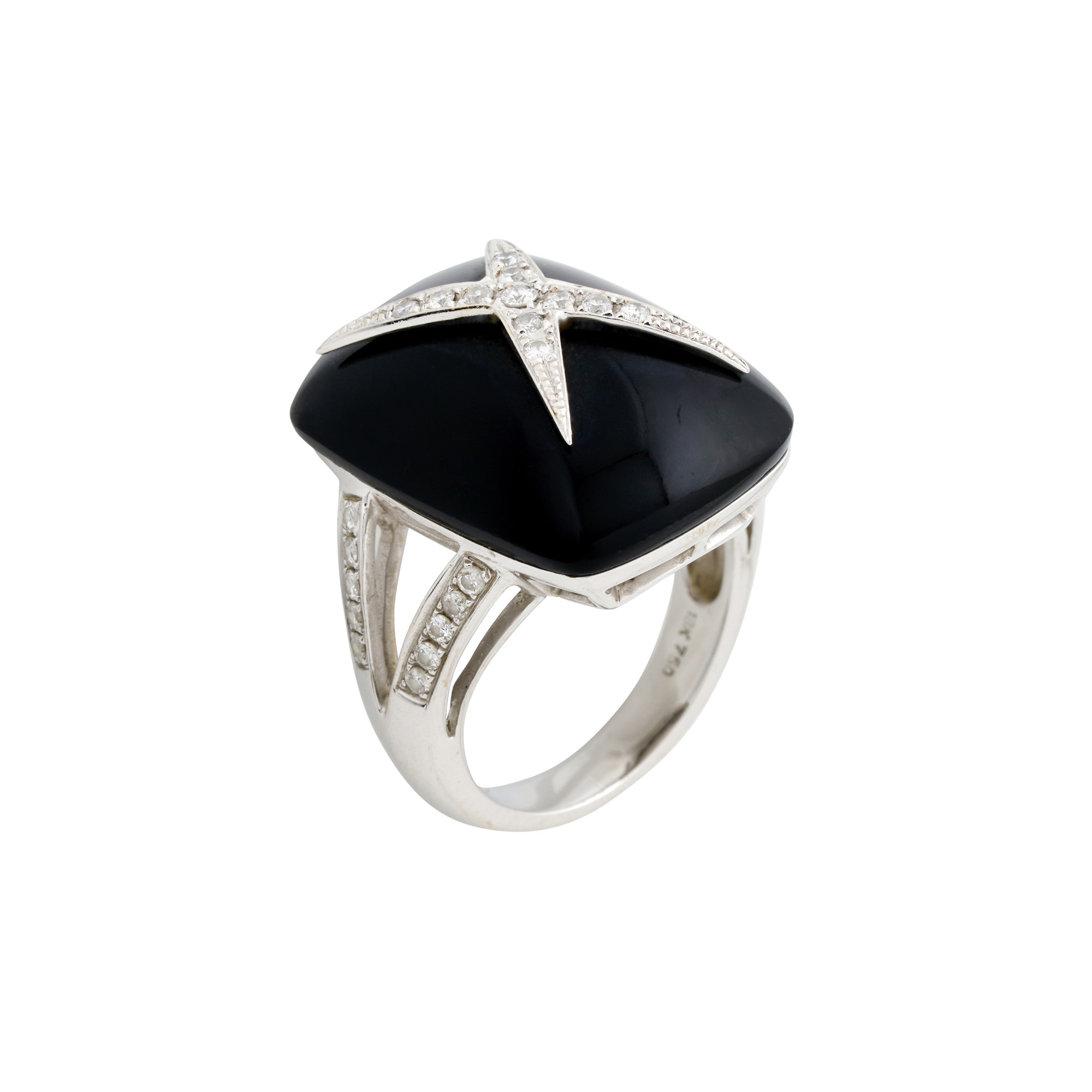 Centring a domed onyx cut en-cabochon centrally set with a cross of claw-set graduating diamonds into points, to a spit band with channel-set diamond shoulders, the diamonds together weighing approximately 0.40 carats, size N1/2, gross weight approximately 14.3 grams.