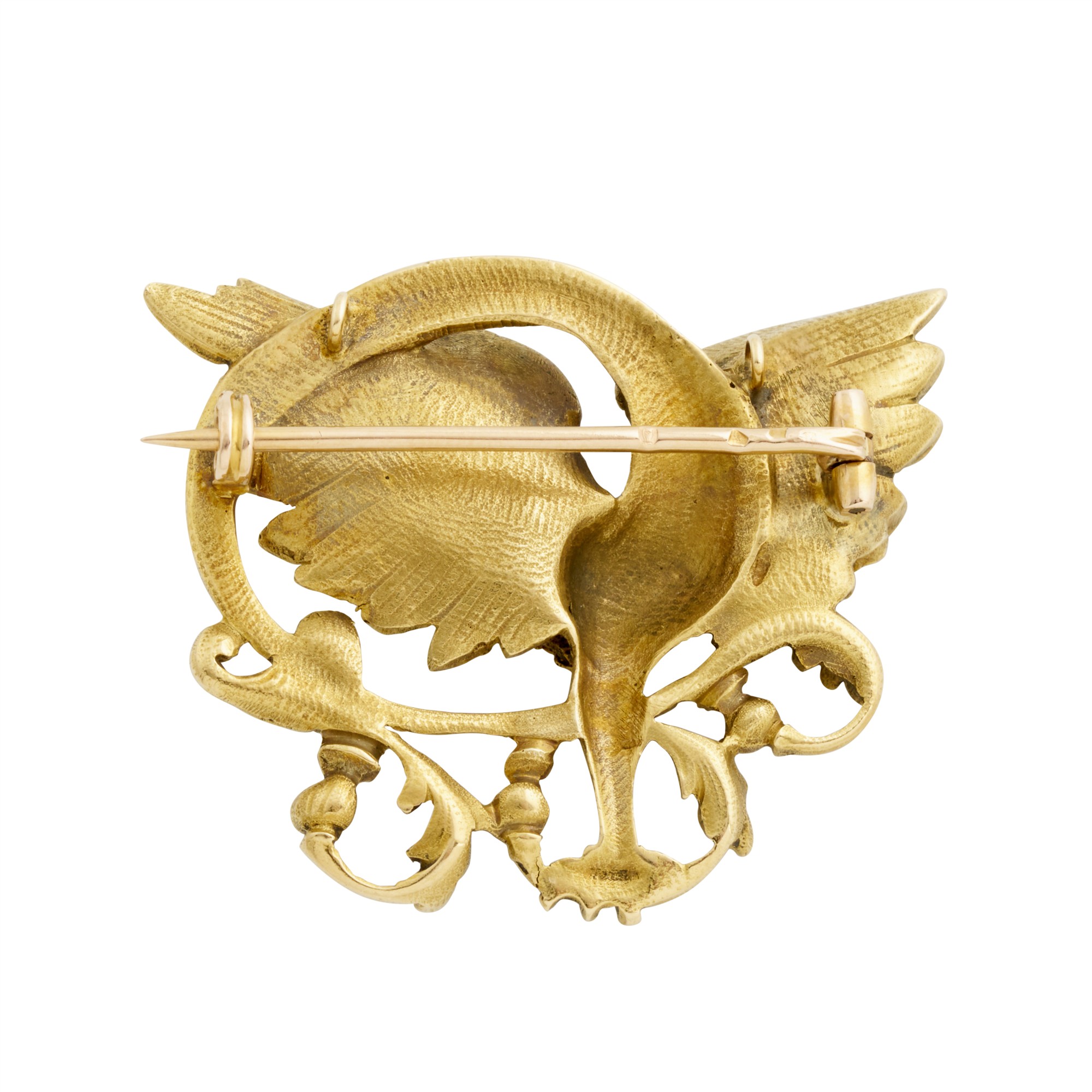 19th Century dragon holding one cultured pearl by the mouth, measuring approximately 4.7mm, to a pin and pendant attachments, width approximately 43mm, gross weight approximately 20.2 grams.