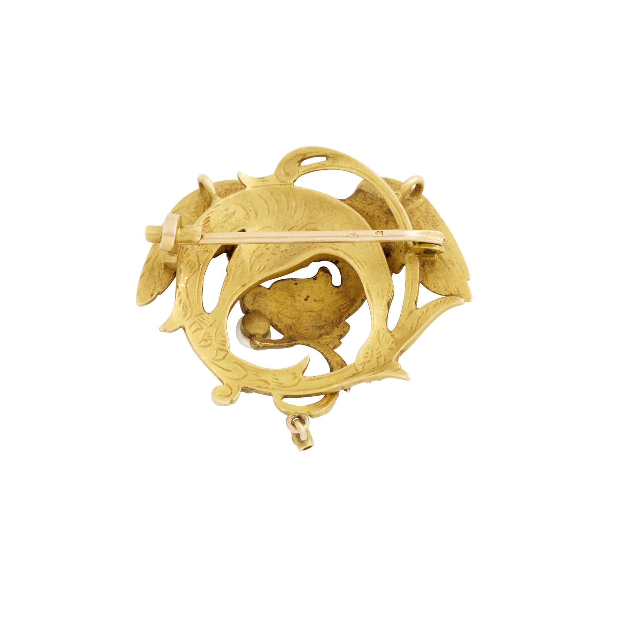 19th Century dragon with one cultured round pearl approximately 4mm, held by the mouth, suspending one seed pearl to a pin and pendant attachments, width approximately 40mm, gross weight approximately 9.7 grams.