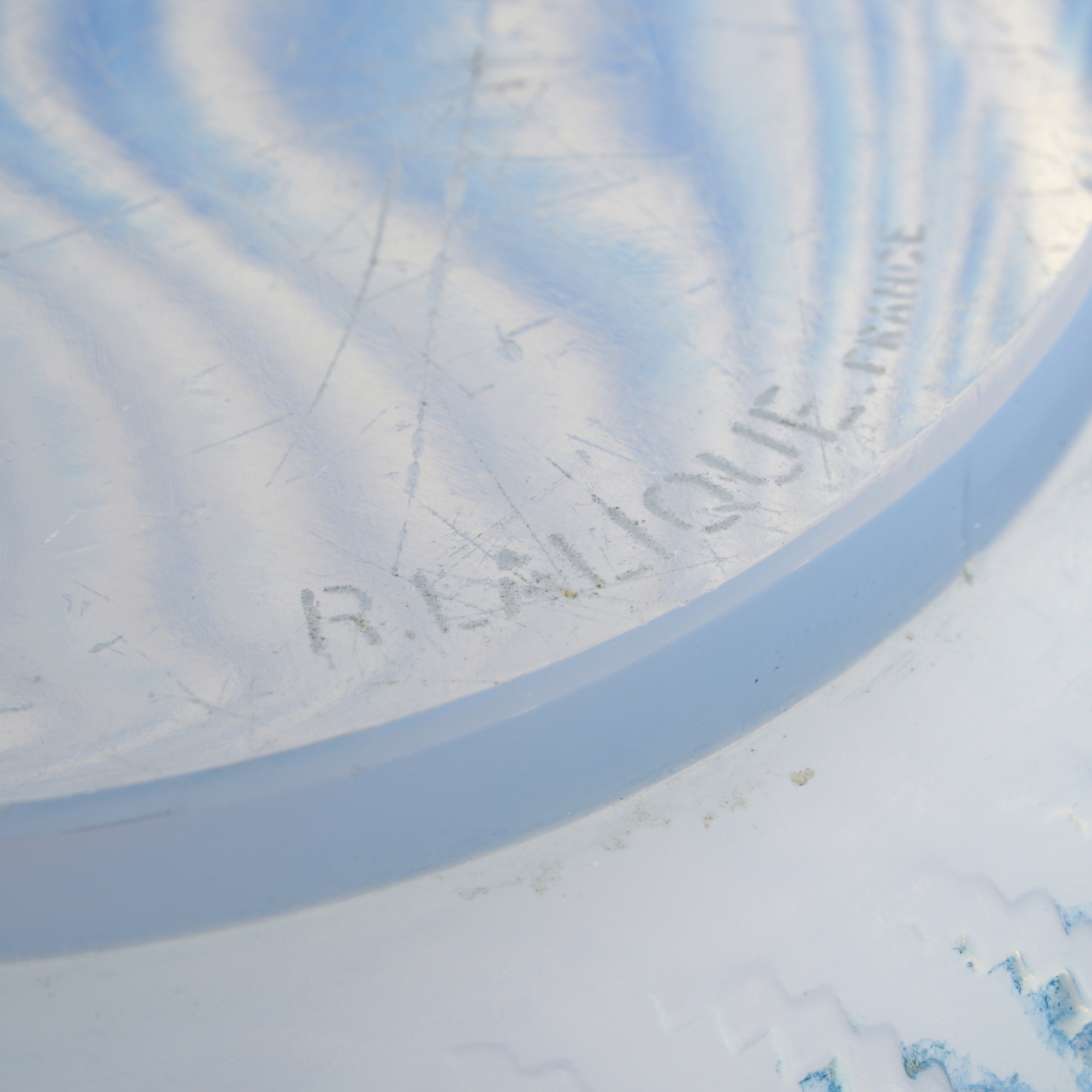 Of waisted and tapering cylindrical shape in opalescent glass, the exterior moulded with serrated wavy ribs, tinted blue between the ribs above and below the waist, stencilled mark underside 'R.LALIQUE FRANCE'
