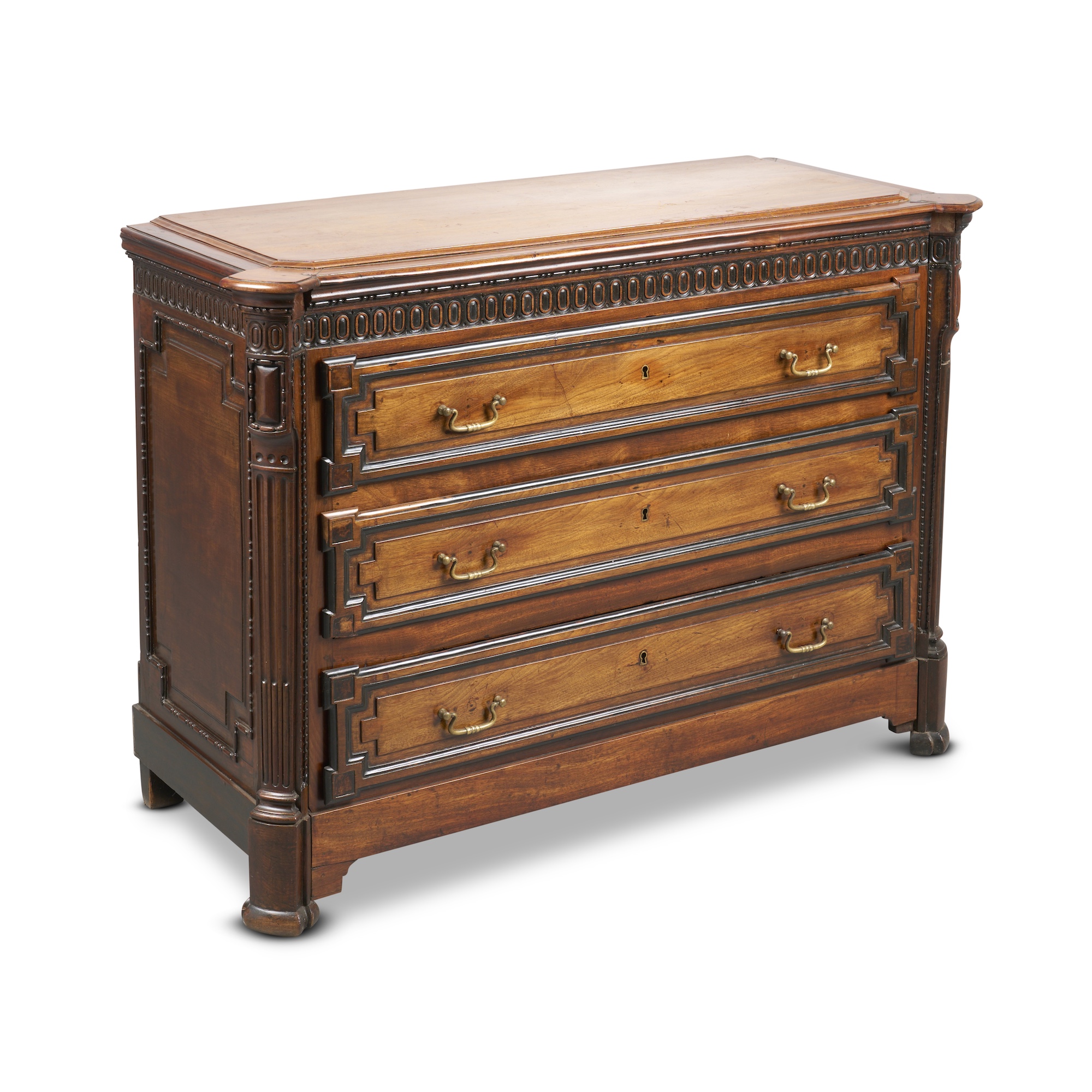 In Classical manner, rectangular, the top with a slightly raised field above the guilloche-carved frieze and three long drawers between canted and fluted pilasters to the front corners descending to feet, the drawer fronts and the sides panelled and moulded