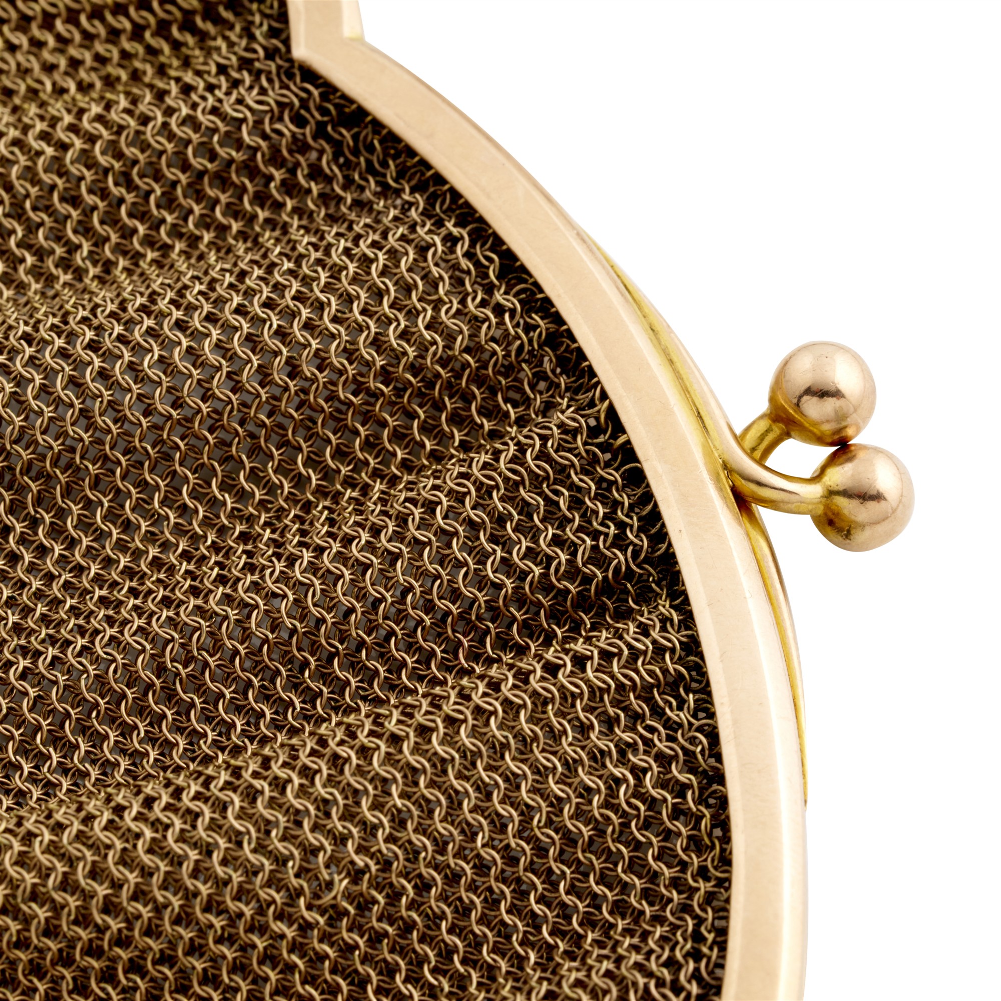 Styled in mesh link, to a structured top and elongated 7ct gold link chain handle, length 140mm, width 150mm, gross weight approximately 150 grams.