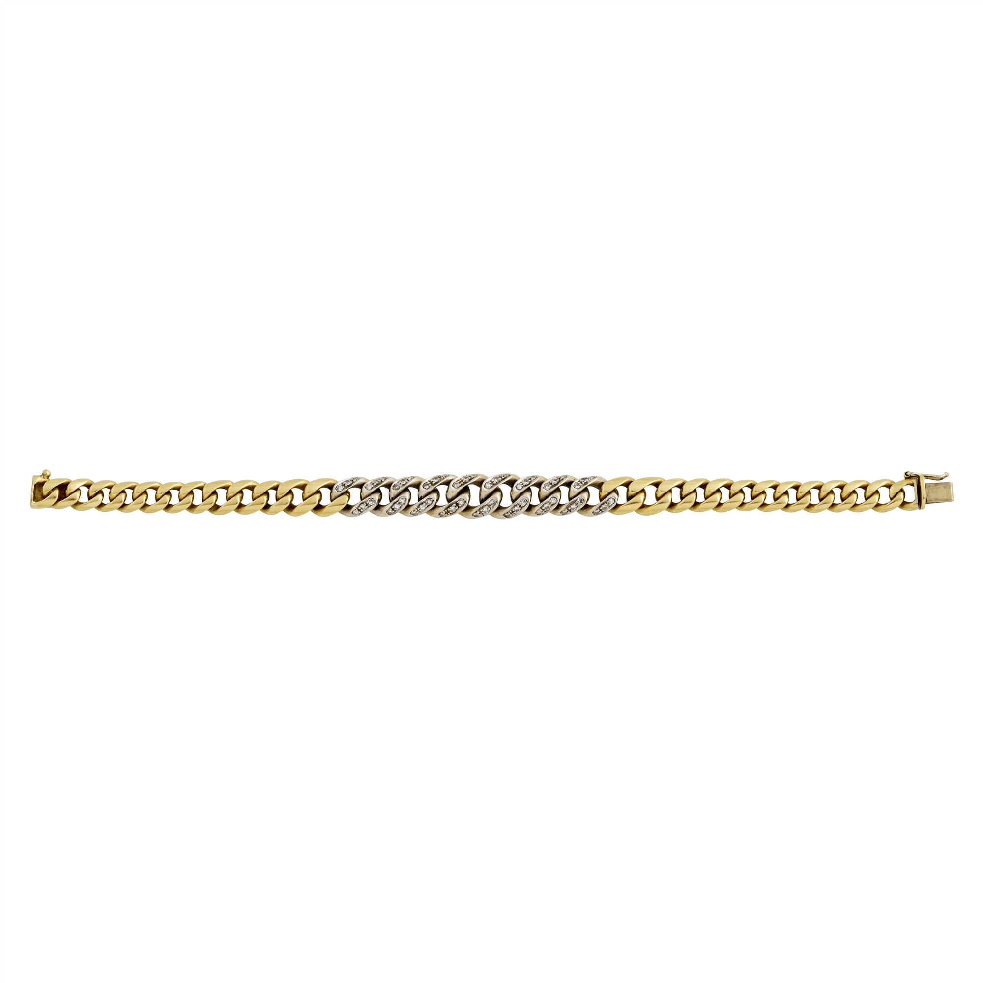 The yellow gold curb link bracelet with nine white gold diamond claw-set links to a box clasp and catch, length approximately, width approximately, gross weight approximately 39.9 grams.