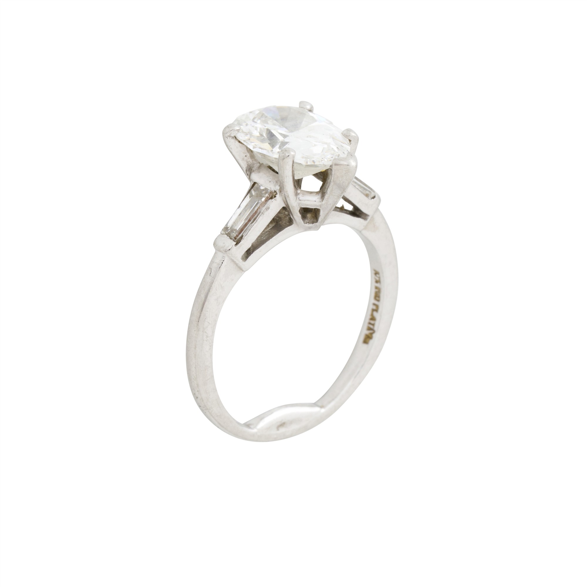 Centring a claw-set pear-cut diamond with two tapered baguettes set to the shoulders on a rounded band, the diamonds together weighing approximately 2.52 carats, size K, gross weight approximately 4.6 grams.
