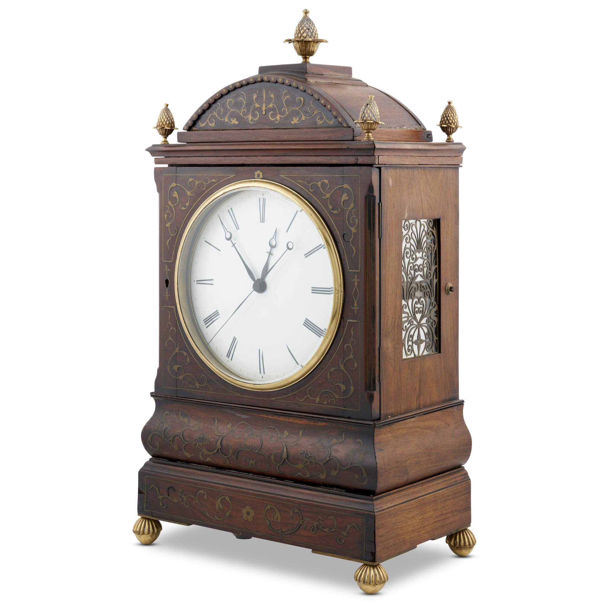 A LATE GEORGIAN BRASS-INLAID ROSEWOOD-CASED MANTEL CLOCK