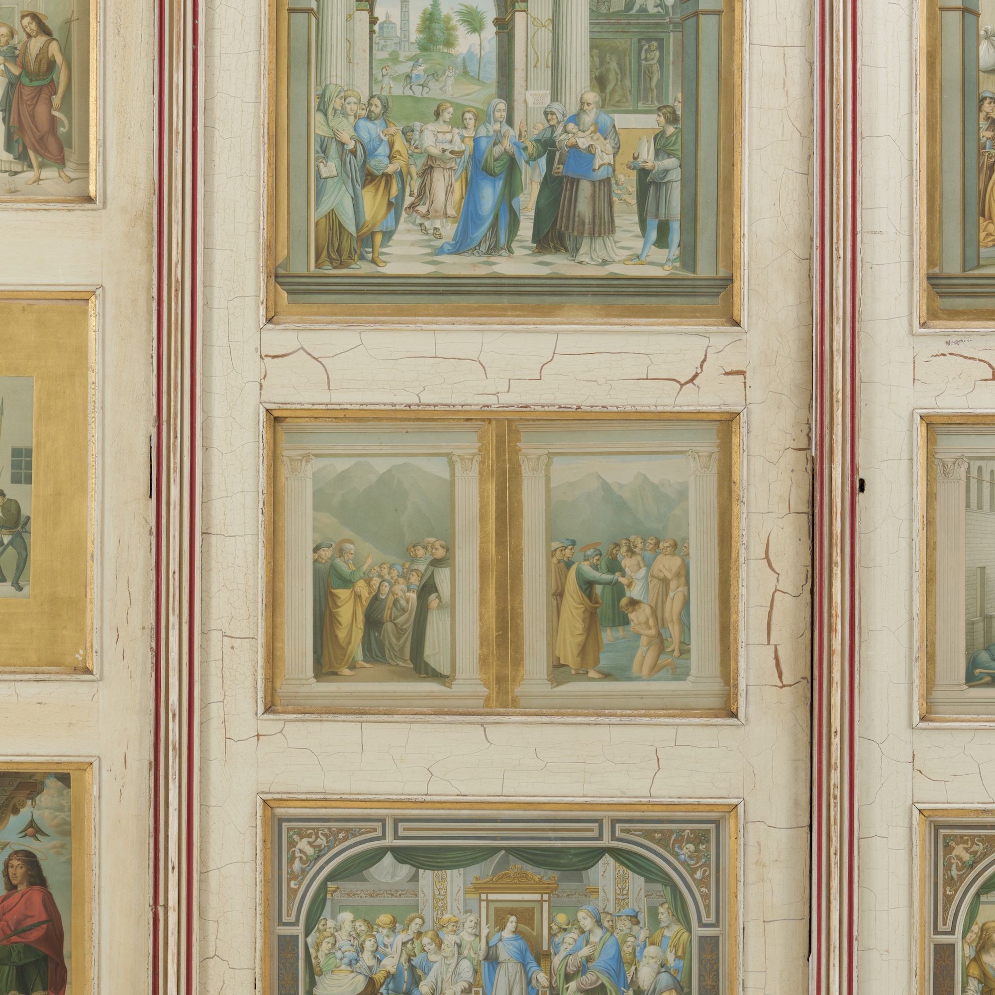Hardwood doors removed from a built-in cupboard or similar, the front of each mounted with chromolithographs published by the Arundel Society reproducing Renaissance religious paintings, each lithograph behind glass fixed within a moulding, the doors otherwise painted and with decorative mouldings and rosettes