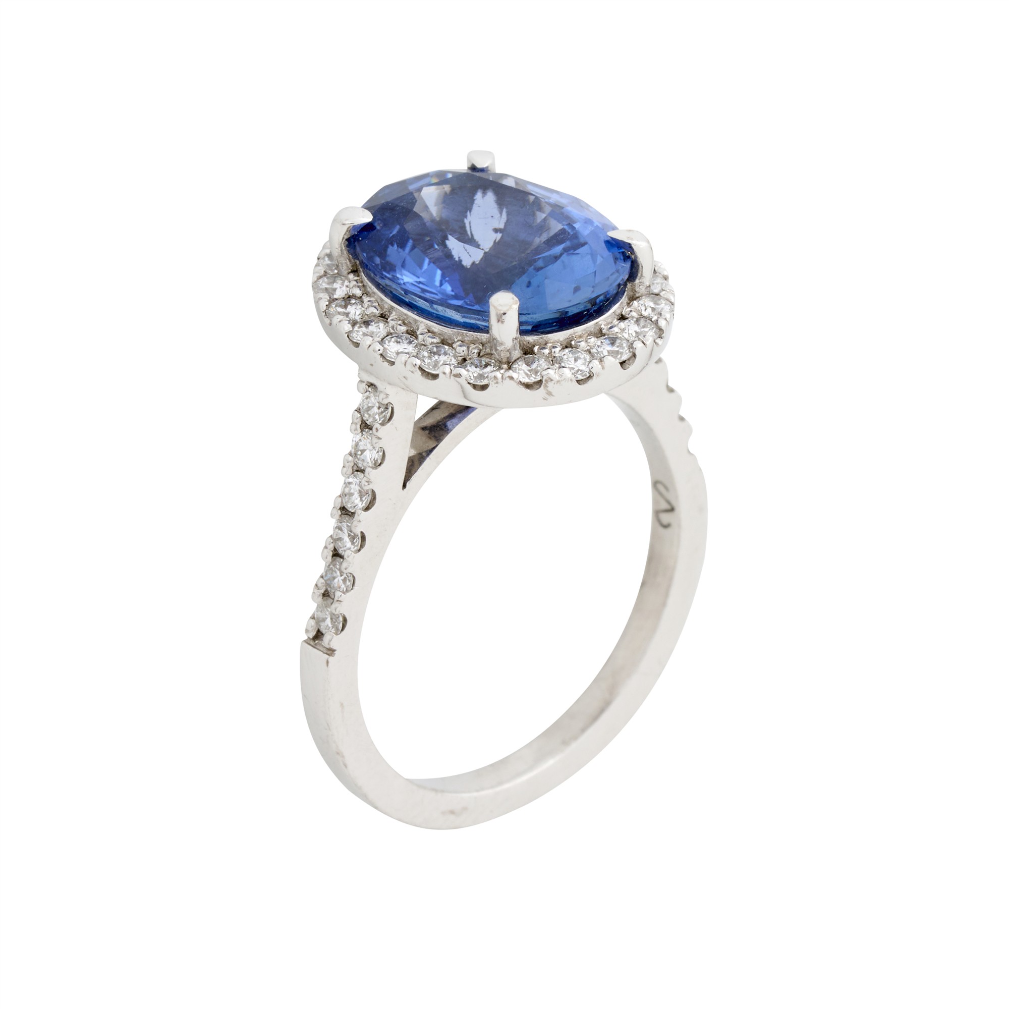 Centring an oval claw-set sapphire of approximately 4.20 carats, surrounded by a claw-set halo of twenty-two round brilliant-cut diamonds to raised shoulders with a further twelve diamonds in a claw-set band, the diamonds together weighing approximately 0.62 carats, size O1/2, gross weight approximately 7.8 grams.