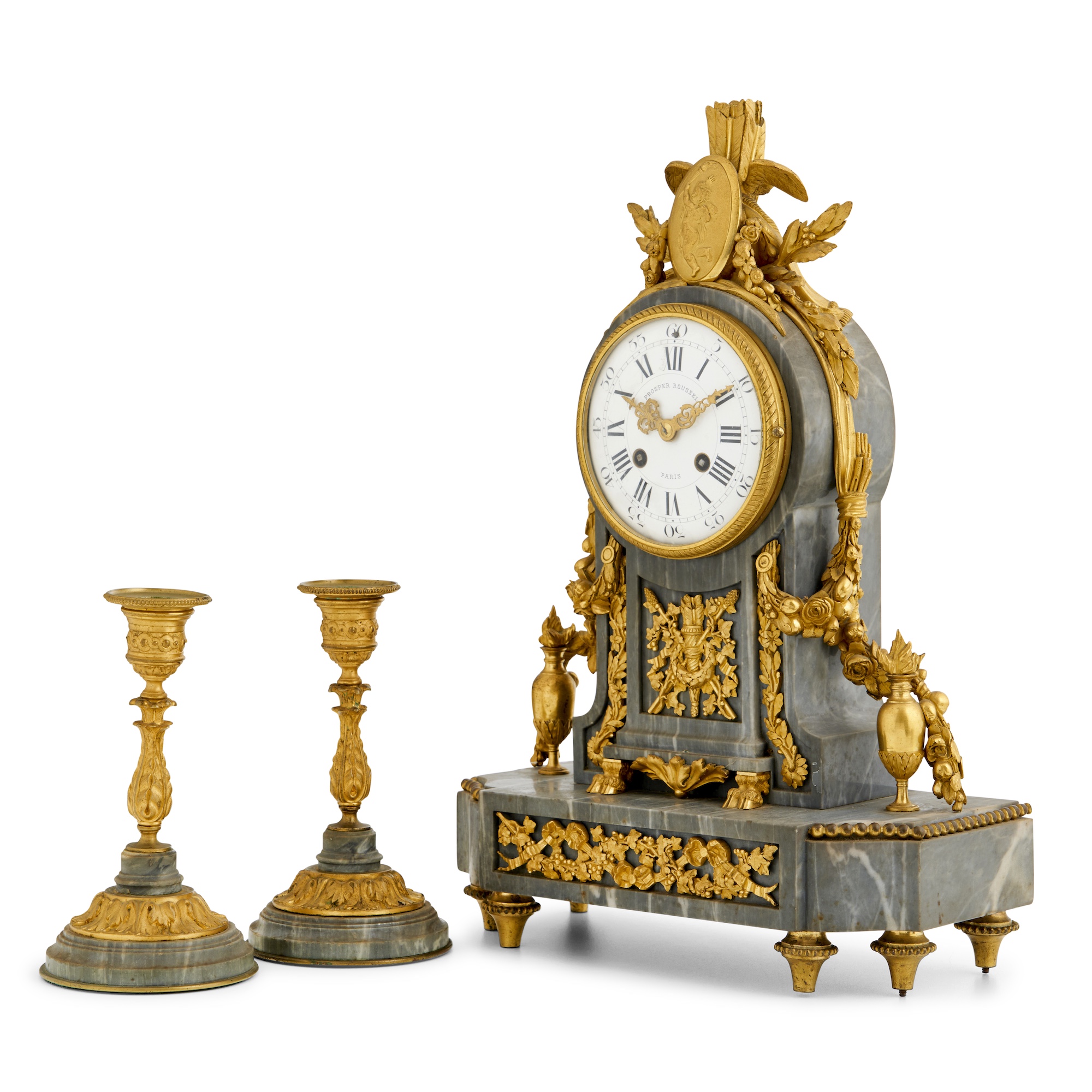 AN ANTIQUE FRENCH ORMOLU-MOUNTED MARBLE MANTEL CLOCK AND CANDLESTICK GARNITURE