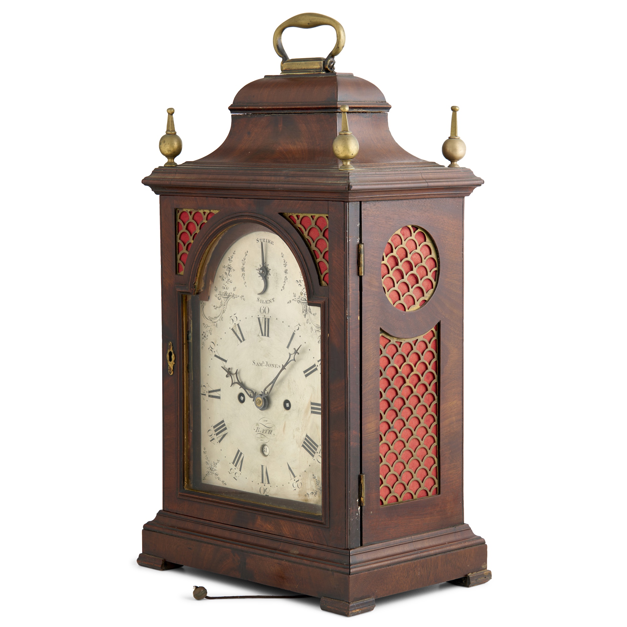 The eight-day double fusee movement with verge escapement and pull repeat striking on a bell, the silvered Roman and Arabic numeral dial beneath a strike / silent dial within engraved spandrels in a bell-top glazed case of typical architectural design with glazed doors front and back, brass grilles to the spandrels of the front and to the sides, and with a brass swing handle to the top, the brass backplate engraved with a decorative design of flowers in an urn in a garden