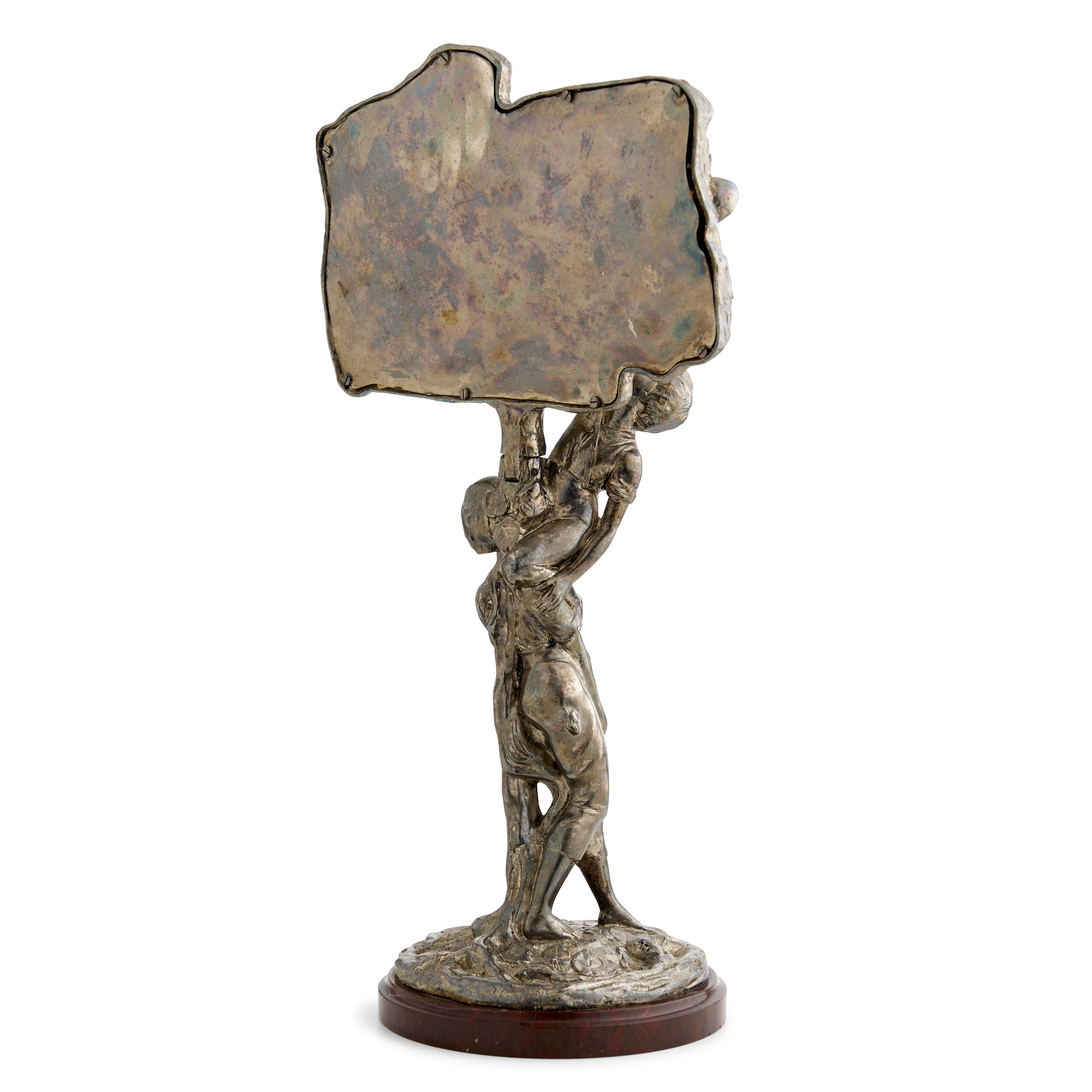 The irregularly shaped and bevelled plate in a frame modelled as the fruiting branches of an apple tree raised on a support combining the trunk of the tree and the figures of a girl lifting a boy to reach the apples, the naturalistically modelled base cast with Jonchery's signature and mounted with a title plaque on a low red marble plinth, the angle of the mirror adjustable