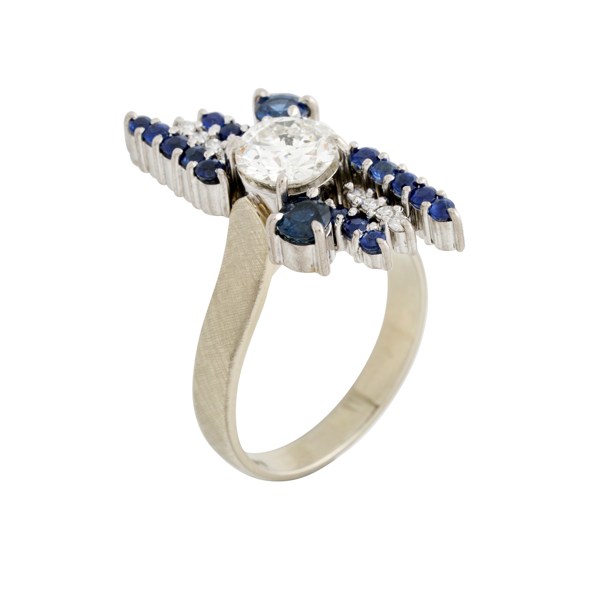 Centring an old-brilliant cut diamond of approximately 1.71 carats, flanked by two round sapphires in a four claw coronet setting with an open back and two rows of claw-set diamonds between a further four rows of claw-set round sapphires, the diamonds together weighing approximately 3.16 carats, size T1/2, gross weight approximately 10.9 grams.