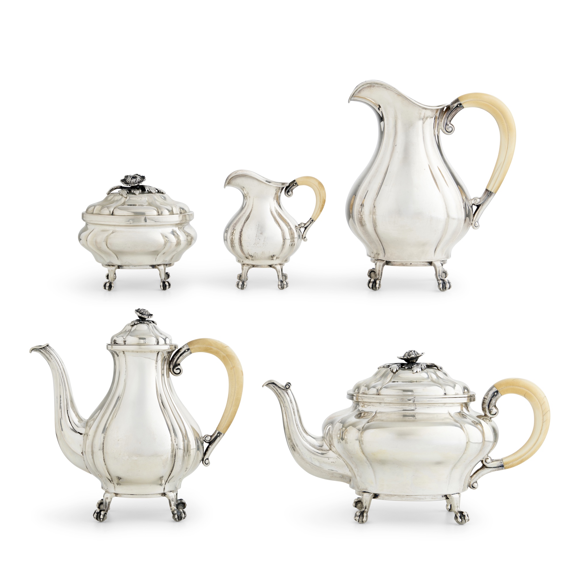 A tray, tea pot, coffee pot, water pitcher, covered sugar basin, and cream jug, the variously baluster-shaped and globular bodies with moulded corners standing on ball-and-claw feet, the domed covers with finials of flowers and leaves, the scrolling loop handles in ivory, the tray with raised moulded edge of conforming outline