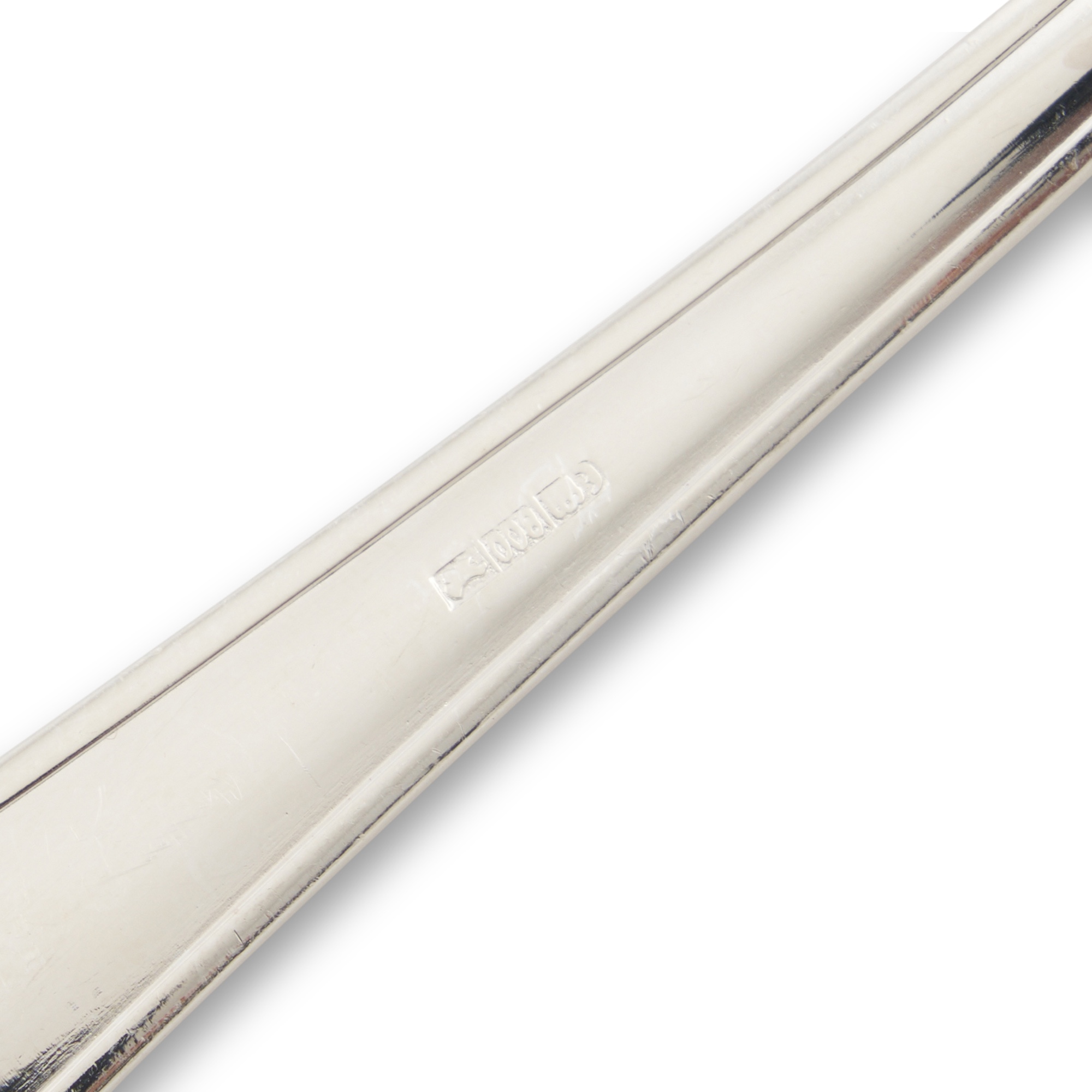 In a modern thread pattern with trefid terminals, a service for twelve, one hundred and forty-four pieces comprising twelve each of fish knives and forks, entrée knives and forks, table knives and forks, cake forks, table spoons, dessert spoons, tea spoons, and coffee spoons, together with twelve various serving pieces including a fish servers, various serving spoons, and a cake lift