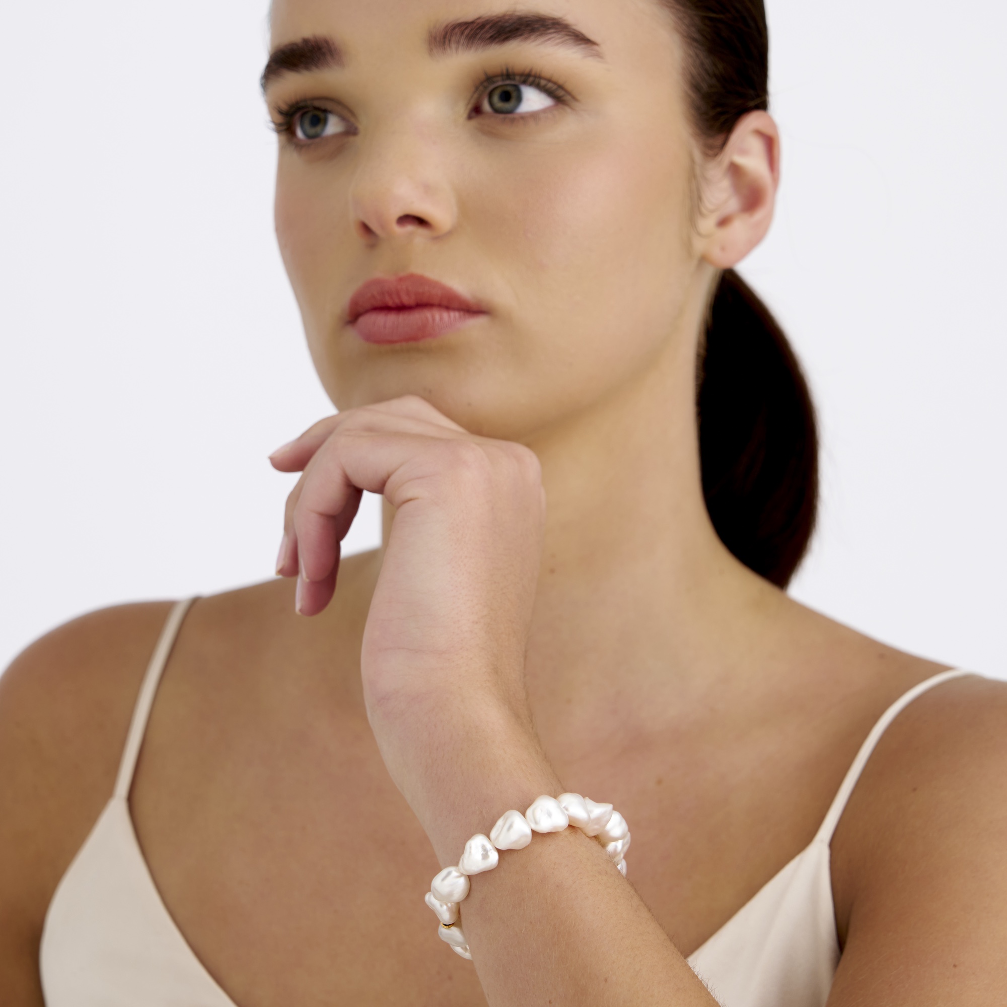 A bracelet of sixteen white south sea baroque Keshi pearls, with excellent lustre, each measuring approximately 9.0mm to an integrated south sea Keshi pearl clasp, length approximately 195mm, gross weight approximately 26.4 grams.